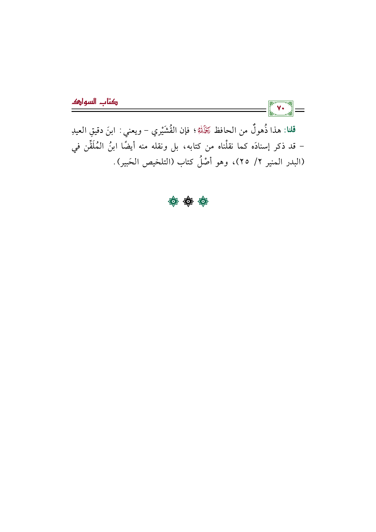 قلنا: هذا ذُهولٌ من الحافظ رحمه الله؛ فإن القُشَيْري - ويعني: ابنَ دقيقِ العيدِ- قد ذكر إسنادَه كما نقلْناه من كتابه، بل ونقله منه أيضًا ابنُ المُلَقِّن في (البدر المنير ٢/ ٢٥)، وهو أصْلُ كتاب (التلخيص الحَبير).