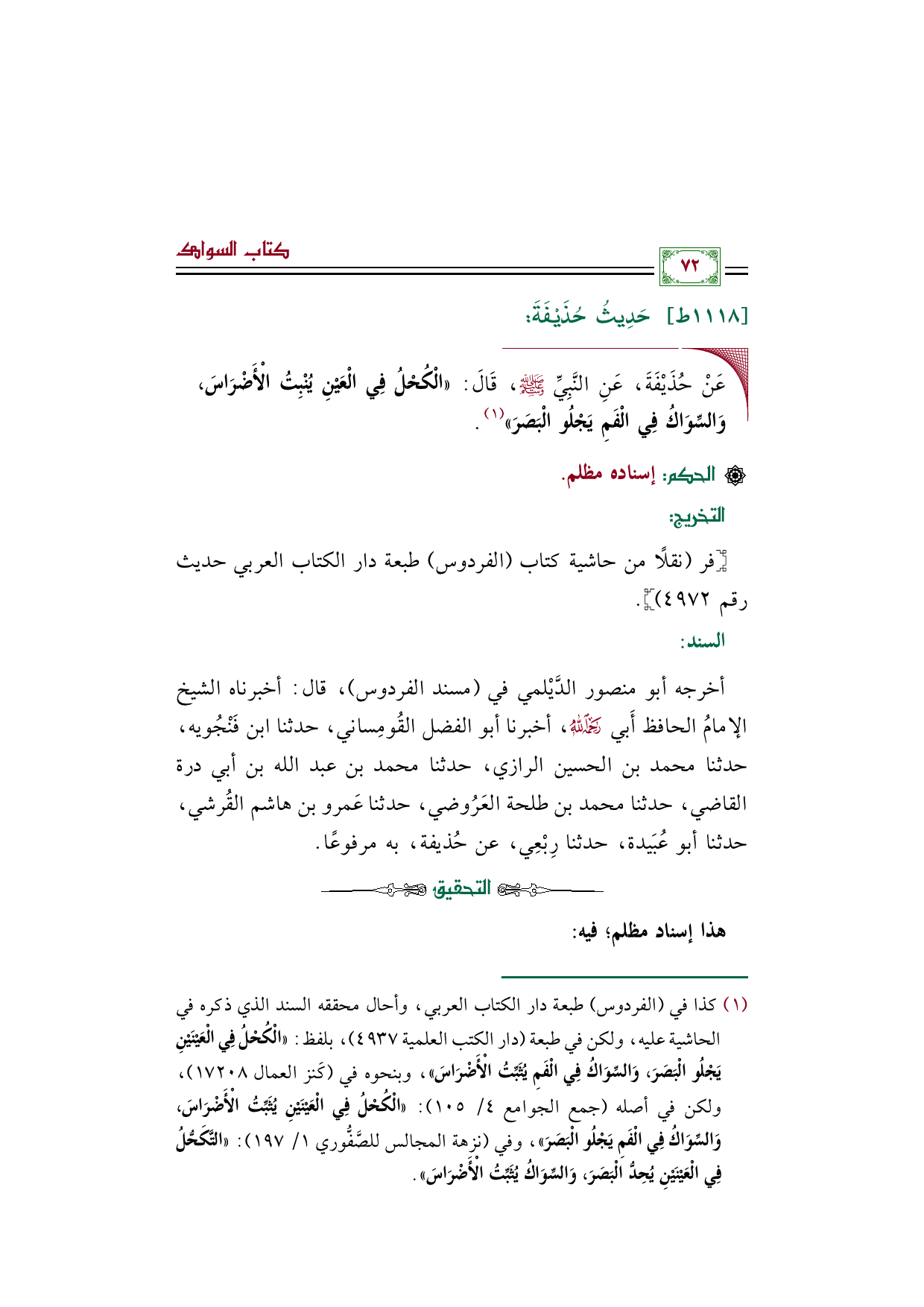 (¬١) كذا في "الفردوس" طبعة دار الكتاب العربي، وأحال محققه السند الذي ذكره في الحاشية عليه، ولكن في طبعة (دار الكتب العلمية ٤٩٣٧)، بلفظ: "الْكُحْلُ فِي الْعَيْنَيْنِ يَجْلُو الْبَصَرَ، وَالسِّوَاكُ فِي الْفَمِ يُثَبِّتُ الْأَضْرَاسَ"، وبنحوه في (كَنز العمال ١٧٢٠٨)، ولكن في أصله (جمع الجوامع ٤/ ١٠٥): "الْكُحْلُ فِي الْعَيْنَيْنِ يُثَبِّتُ الْأَضْرَاسَ، وَالسِّوَاكُ فِي الْفَمِ يَجْلُو الْبَصَرَ"، وفي (نزهة المجالس للصَّفُّوري ١/ ١٩٧): ((التَّكَحُّلُ فِي الْعَيْنَيْنِ يُحِدُّ الْبَصَرَ، وَالسِّوَاكُ يُثَبِّتُ الْأَضْرَاسَ)).