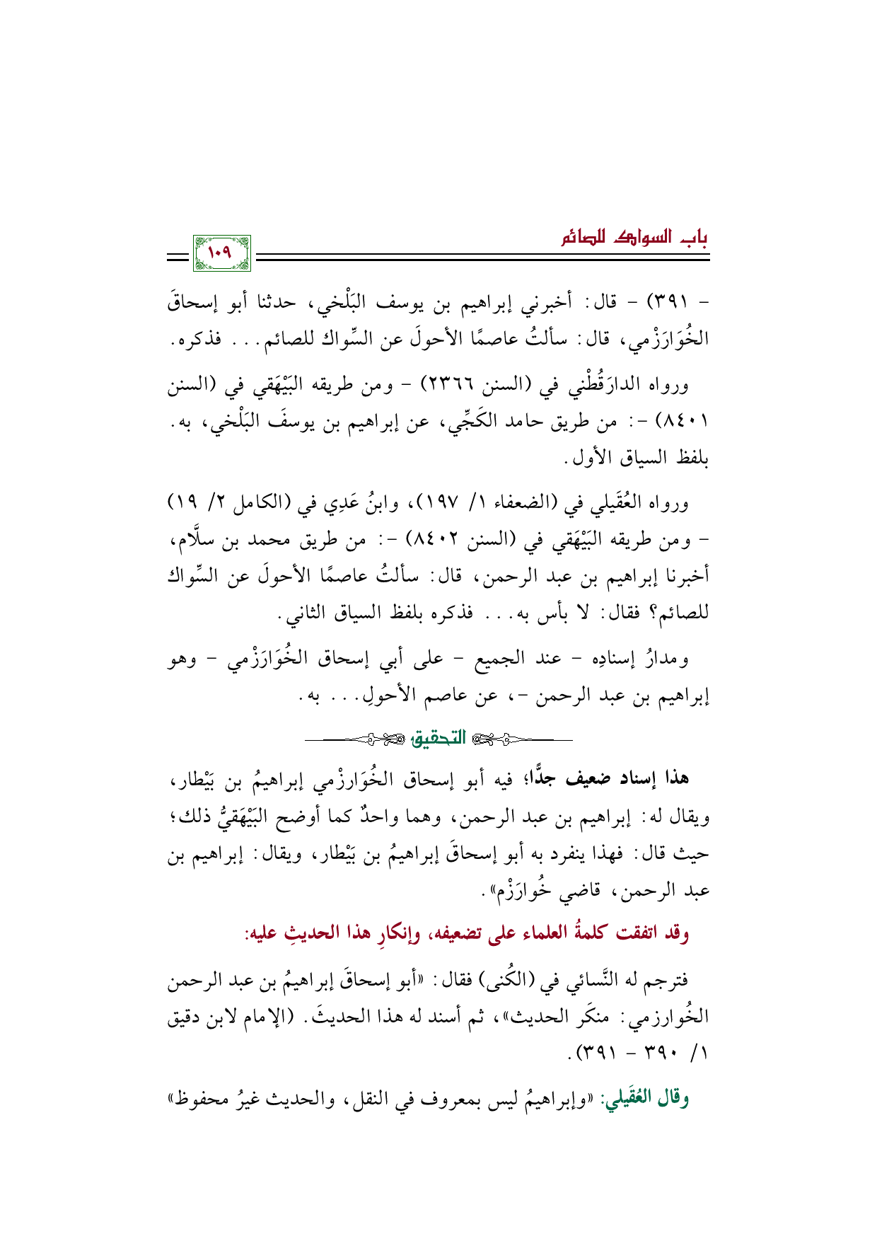 - ٣٩١) - قال: أخبرني إبراهيم بن يوسف البَلْخي، حدثنا أبو إسحاقَ الخُوَارَزْمي، قال: سألتُ عاصمًا الأحولَ عن السِّواك للصائم ... فذكره.
