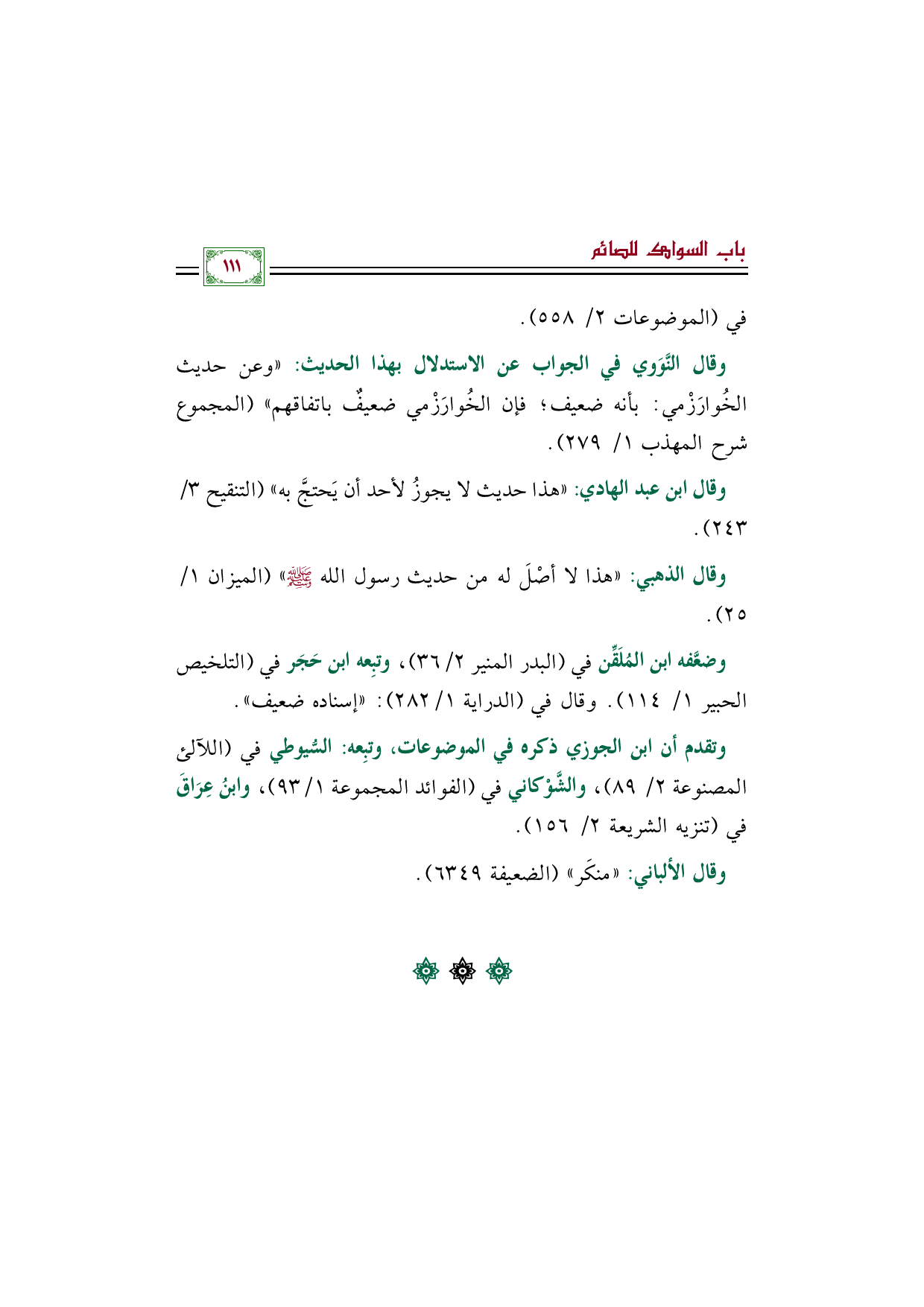 وقال النَّوَوي في الجواب عن الاستدلال بهذا الحديث: "وعن حديث الخُوارَزْمي: بأنه ضعيف؛ فإن الخُوارَزْمي ضعيفٌ باتفاقهم" (المجموع شرح المهذب ١/ ٢٧٩).