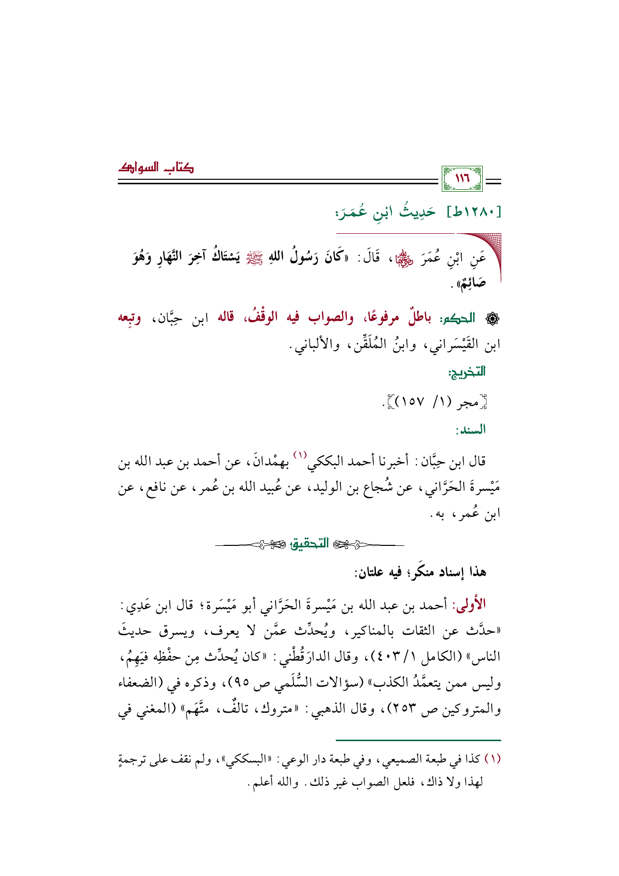 قال ابن حِبَّان: أخبرنا أحمد البككي (¬١) بهمْدانَ، عن أحمد بن عبد الله بن مَيْسرةَ الحَرَّاني، عن شُجاع بن الوليد، عن عُبيد الله بن عُمر، عن نافع، عن ابن عُمر، به.