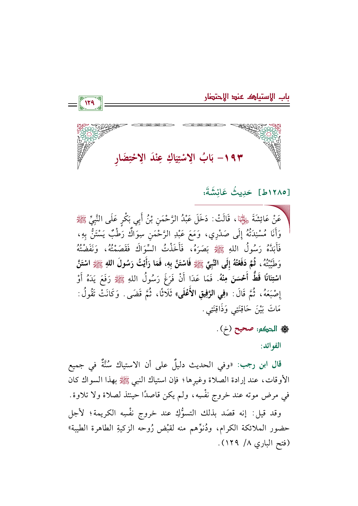 وقد قيل: إنه قصَد بذلك التسوُّكِ عند خروج نفْسِه الكريمة؛ لأجل حضور الملائكة الكرام، ودُنوِّهم منه لقبْض رُوحه الزكيةِ الطاهرة الطيبة" (فتح الباري ٨/ ١٢٩).