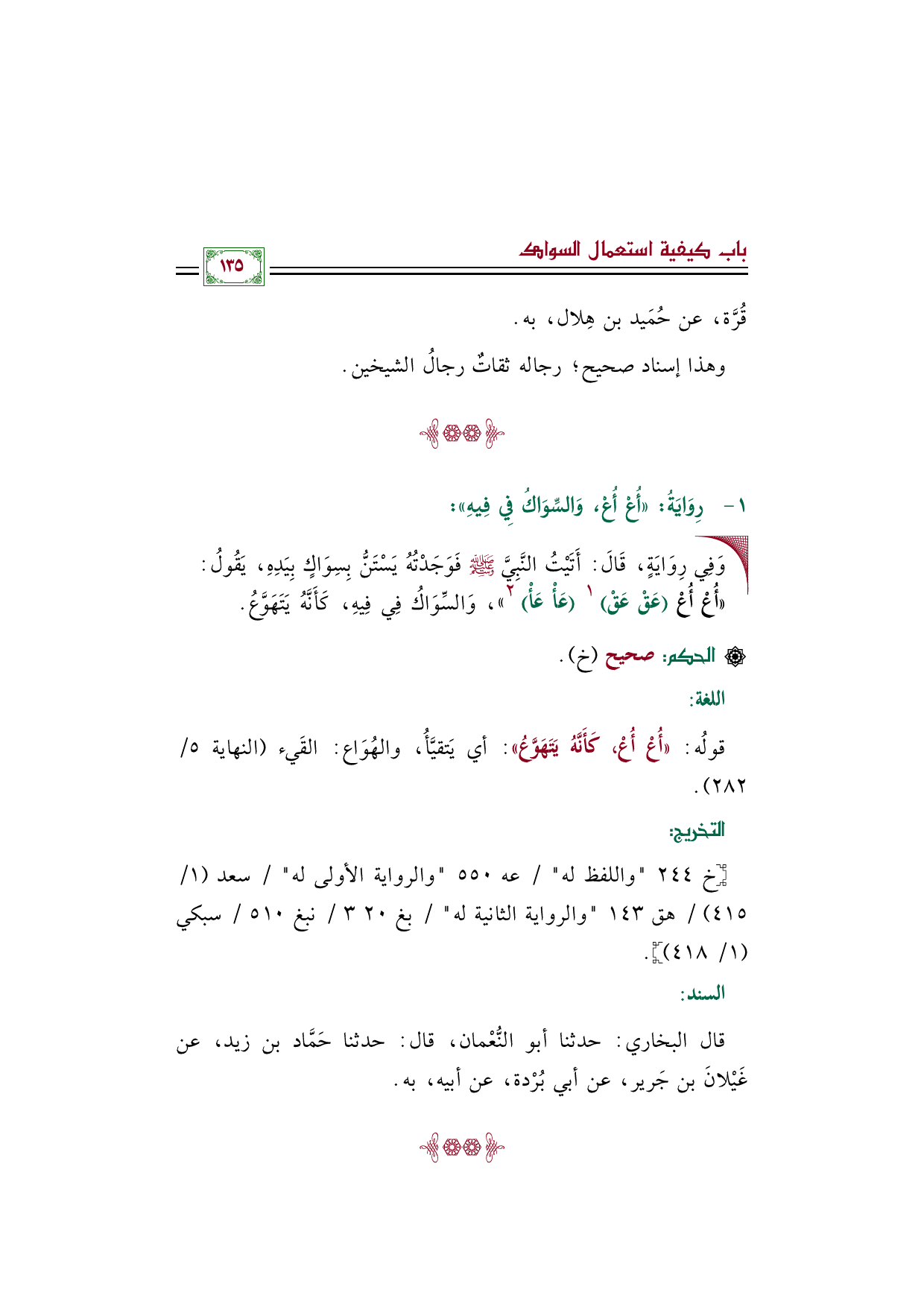 • وَفِي رِوَايَةٍ، قَالَ: أَتَيْتُ النَّبِيَّ صَلَّى اللهُ عَلَيْهِ وَسَلَّمَ فَوَجَدْتُهُ يَسْتَنُّ بِسِوَاكٍ بِيَدِهِ، يَقُولُ: ((أُعْ أُعْ (عَقْ عَقْ) ١ (عَأْ عَأْ) ٢))، وَالسِّوَاكُ فِي فِيهِ، كَأَنَّهُ يَتَهَوَّعُ.
