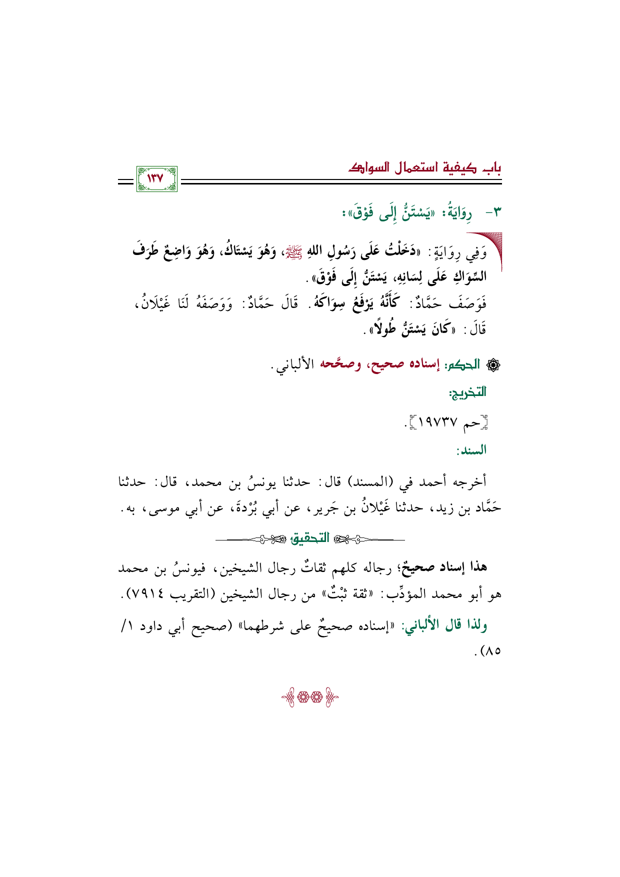 أخرجه أحمد في (المسند) قال: حدثنا يونسُ بن محمد، قال: حدثنا حَمَّاد بن زيد، حدثنا غَيْلانُ بن جَرير، عن أبي بُرْدةَ، عن أبي موسى، به.