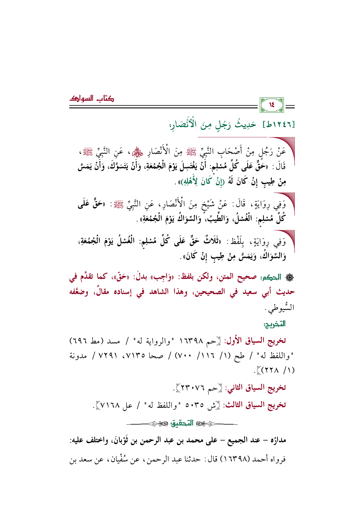 ◼ عَنْ رَجُلٍ مِنْ أَصْحَابِ النَّبِيِّ صَلَّى اللهُ عَلَيْهِ وَسَلَّمَ مِنَ الْأَنْصَارِ رَضِيَ اللهُ عَنْهُمْ، عَنِ النَّبِيِّ صَلَّى اللهُ عَلَيْهِ وَسَلَّمَ، قَالَ: ((حَقٌّ عَلَى كُلِّ مُسْلِمٍ: أَنْ يَغْتَسِلَ يَوْمَ الْجُمُعَةِ، وَأَنْ يَتَسَوَّكَ، وَأَنْ يَمَسَّ مِنْ طِيبٍ إِنْ كَانَ لَهُ (إِنْ كَانَ لِأَهْلِهِ))).