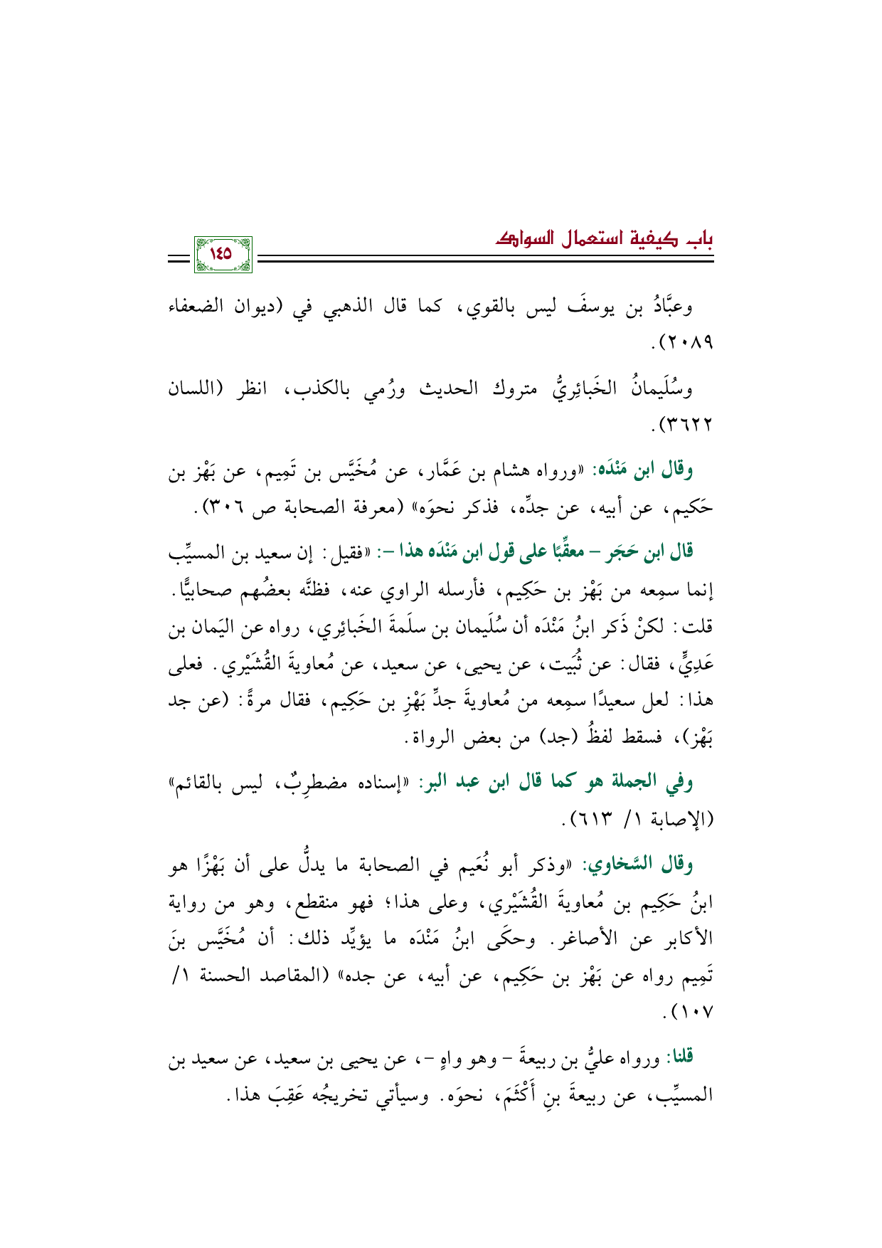 وقال السَّخاوي: "وذكر أبو نُعَيم في الصحابة ما يدلُّ على أن بَهْزًا هو ابنُ حَكِيم بن مُعاويةَ القُشَيْري، وعلى هذا؛ فهو منقطع، وهو من رواية الأكابر عن الأصاغر. وحكَى ابنُ مَنْدَه ما يؤيِّد ذلك: أن مُخَيَّس بنَ تَمِيم رواه عن بَهْز بن حَكِيم، عن أبيه، عن جده" (المقاصد الحسنة ١/ ١٠٧).