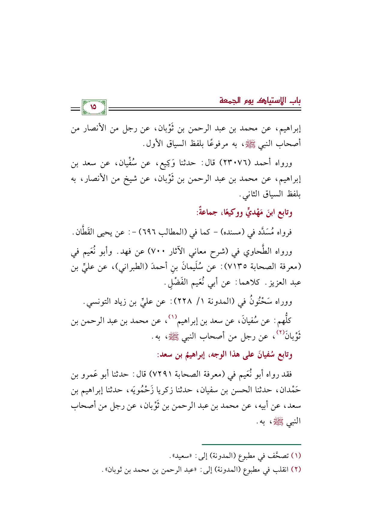 ورواه أحمد (٢٣٠٧٦) قال: حدثنا وَكِيع، عن سُفْيان، عن سعد بن إبراهيم، عن محمد بن عبد الرحمن بن ثَوْبان، عن شيخ من الأنصار، به بلفظ السياق الثاني.