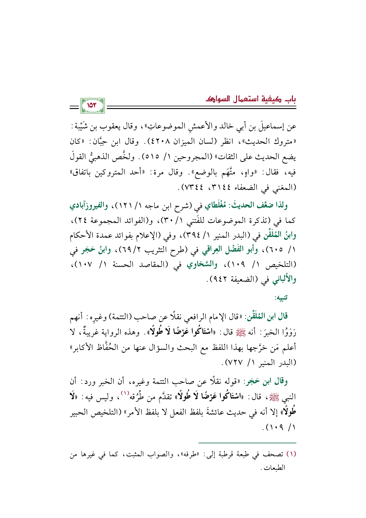 وقال ابن حَجَر: "قوله نقلًا عن صاحب التتمة وغيره، أن الخبر ورد: أن النبي صلى الله عليه وسلم، قال: ((اسْتَاكُوا عَرْضًا لَا طُولًا)) تقدَّم من طُرُقه (¬١)، وليس فيه: ((لَا طُولًا)) إلا أنه في حديث عائشةَ بلفظ الفعل لا بلفظ الأمر" (التلخيص الحبير ١/ ١٠٩).