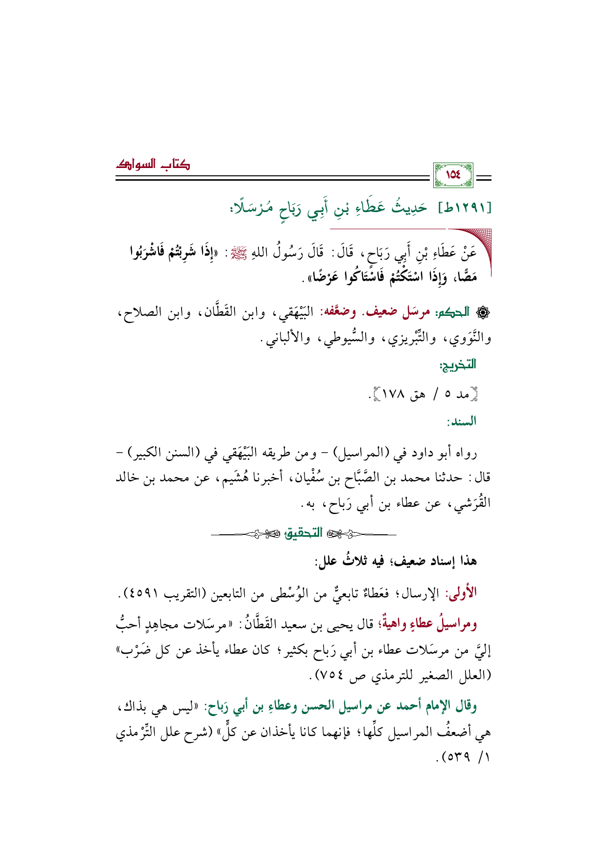 [الحكم]: مرسَل ضعيف. وضعَّفه: البَيْهَقي، وابن القَطَّان، وابن الصلاح، والنَّوَوي، والتِّبْريزي، والسُّيوطي، والألباني.