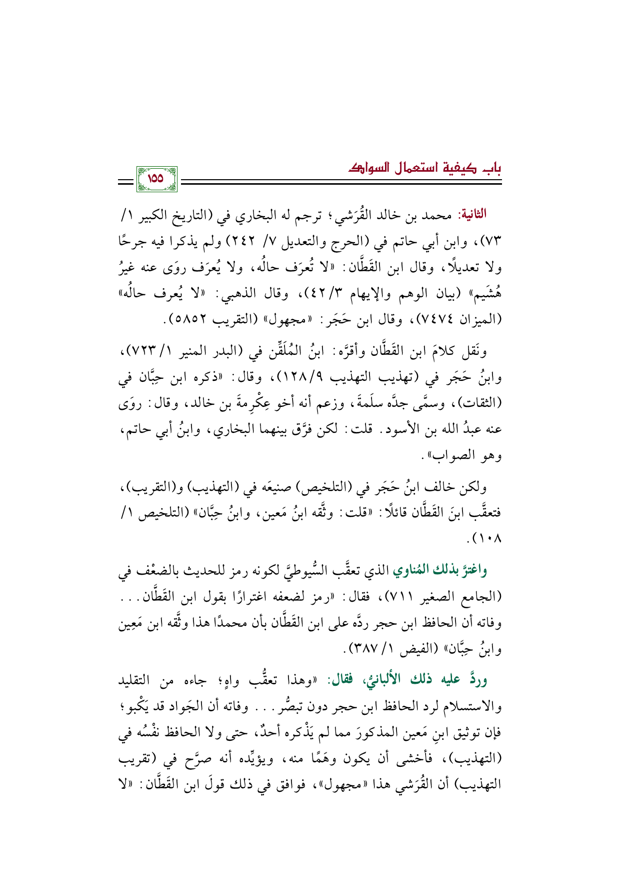 وردَّ عليه ذلك الألبانيُّ، فقال: "وهذا تعقُّب واهٍ؛ جاءه من التقليد والاستسلام لرد الحافظ ابن حجر دون تبصُّر ... وفاته أن الجَواد قد يَكْبو؛ فإن توثيق ابنِ مَعين المذكورَ مما لم يَذْكره أحدٌ، حتى ولا الحافظ نفْسُه في "التهذيب"، فأخشى أن يكون وهَمًا منه، ويؤيِّده أنه صرَّح في "تقريب التهذيب" أن القُرَشي هذا "مجهول"، فوافق في ذلك قولَ ابن القَطَّان: "لا
