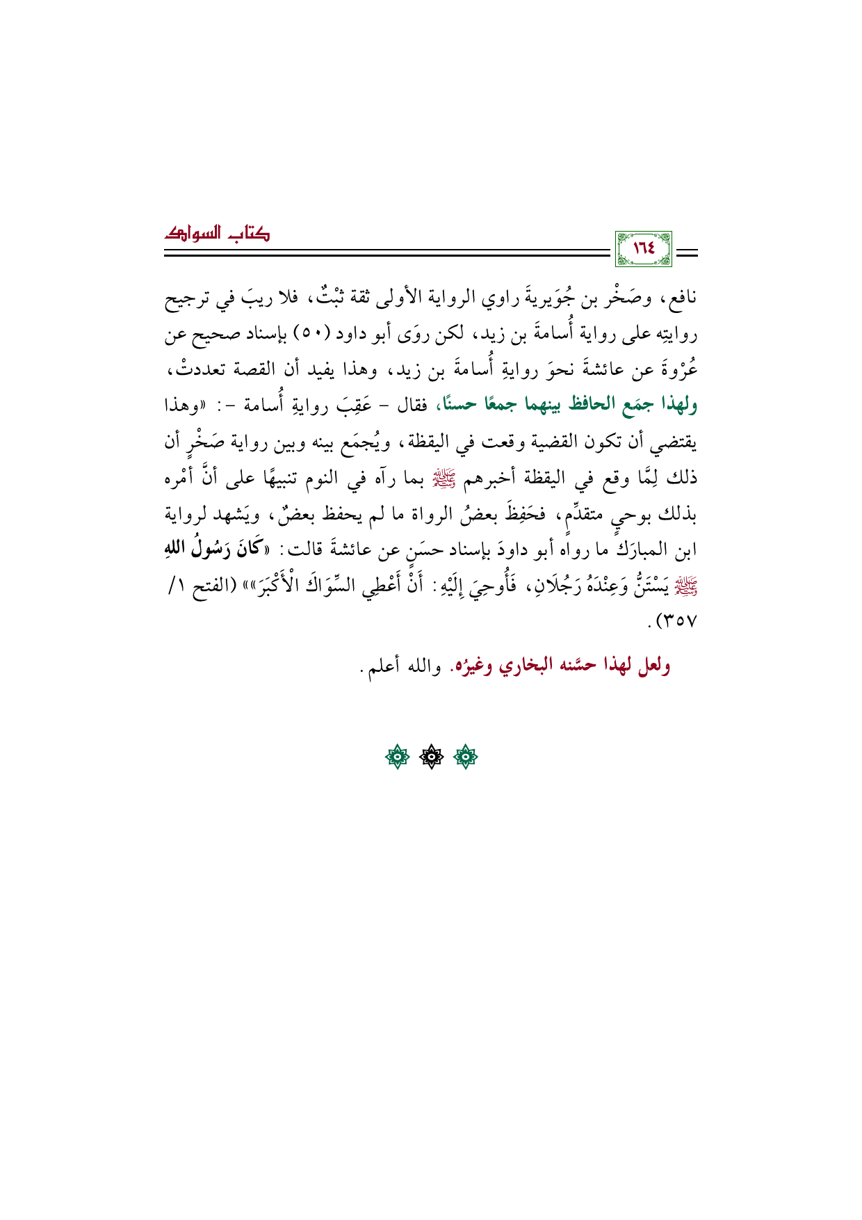 نافع، وصَخْر بن جُوَيريةَ راوي الرواية الأولى ثقة ثبْتٌ، فلا ريبَ في ترجيح روايتِه على رواية أُسامةَ بن زيد، لكن روَى أبو داود (٥٠) بإسناد صحيح عن عُرْوةَ عن عائشةَ نحوَ روايةِ أُسامةَ بن زيد، وهذا يفيد أن القصة تعددتْ، ولهذا جمَع الحافظ بينهما جمعًا حسنًا، فقال- عَقِبَ روايةِ أُسامة-: "وهذا يقتضي أن تكون القضية وقعت في اليقظة، ويُجمَع بينه وبين رواية صَخْرٍ أن ذلك لِمَّا وقع في اليقظة أخبرهم صلى الله عليه وسلم بما رآه في النوم تنبيهًا على أنَّ أمْره بذلك بوحيٍ متقدِّمٍ، فحَفِظَ بعضُ الرواة ما لم يحفظ بعضٌ، ويَشهد لرواية ابن المبارَك ما رواه أبو داودَ بإسناد حسَنٍ عن عائشةَ قالت: ((كَانَ رَسُولُ اللهِ صَلَّى اللهُ عَلَيْهِ وَسَلَّمَ يَسْتَنُّ وَعِنْدَهُ رَجُلَانِ، فَأُوحِيَ إِلَيْهِ: أَنْ أَعْطِي السِّوَاكَ الْأَكْبَرَ)) " (الفتح ١/ ٣٥٧).