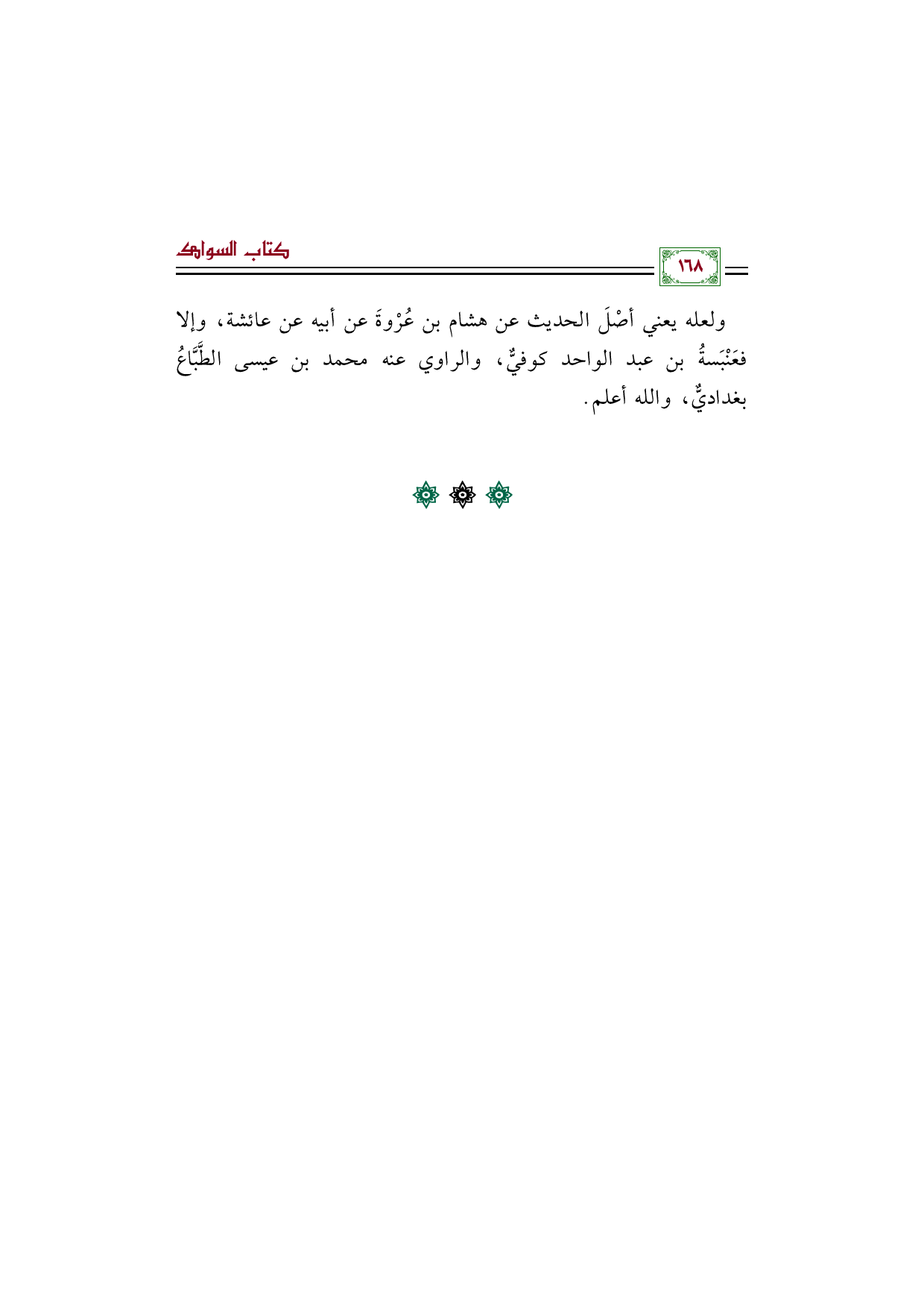 ولعله يعني أصْلَ الحديث عن هشام بن عُرْوةَ عن أبيه عن عائشة، وإلا فعَنْبَسةُ بن عبد الواحد كوفيٌّ، والراوي عنه محمد بن عيسى الطَّبَّاعُ بغداديٌّ، والله أعلم.