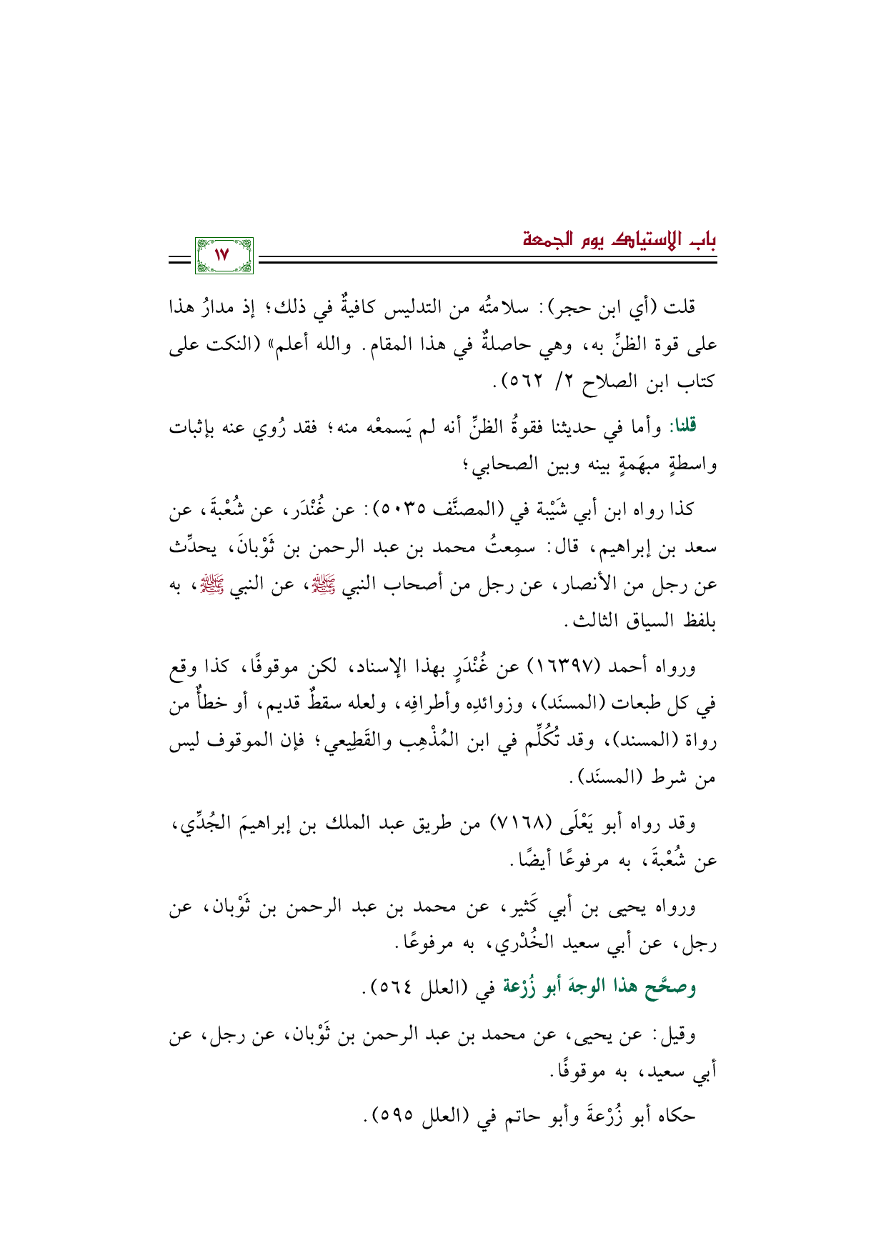 كذا رواه ابن أبي شَيْبة في (المصنَّف ٥٠٣٥): عن غُنْدَر، عن شُعْبةَ، عن سعد بن إبراهيم، قال: سمِعتُ محمد بن عبد الرحمن بن ثَوْبانَ، يحدِّث عن رجل من الأنصار، عن رجل من أصحاب النبي صلى الله عليه وسلم، عن النبي صلى الله عليه وسلم، به بلفظ السياق الثالث.
