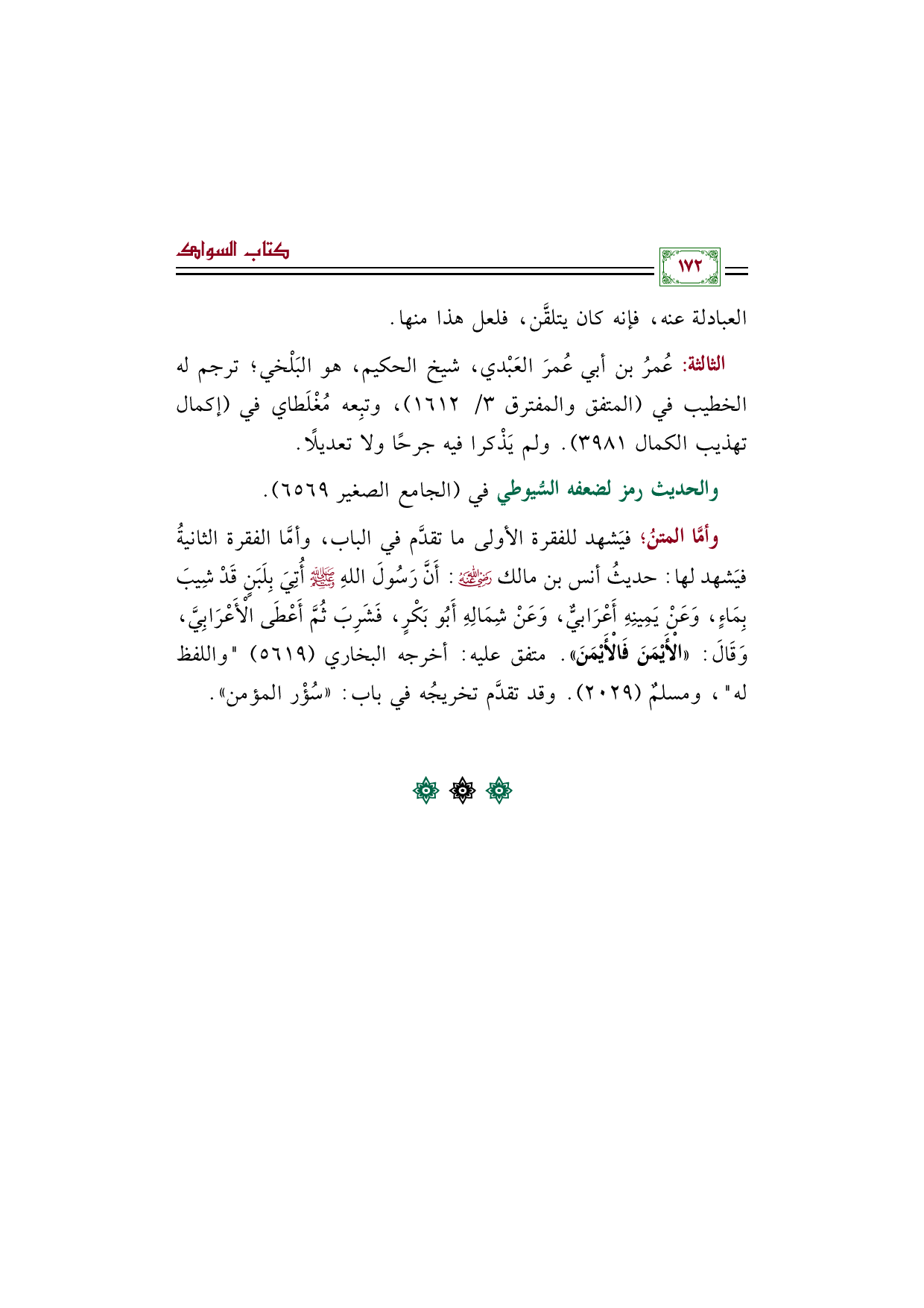 وأمَّا المتنُ؛ فيَشهد للفقرة الأولى ما تقدَّم في الباب، وأمَّا الفقرة الثانيةُ فيَشهد لها: حديثُ أنس بن مالك رضي الله عنه: أَنَّ رَسُولَ اللهِ صَلَّى اللهُ عَلَيْهِ وَسَلَّمَ أُتِيَ بِلَبَنٍ قَدْ شِيبَ بِمَاءٍ، وَعَنْ يَمِينِهِ أَعْرَابيٌّ، وَعَنْ شِمَالِهِ أَبُو بَكْرٍ، فَشَرِبَ ثُمَّ أَعْطَى الْأَعْرَابِيَّ، وَقَالَ: ((الْأَيْمَنَ فَالْأَيْمَنَ)). متفق عليه: أخرجه البخاري (٥٦١٩) "واللفظ له"، ومسلمٌ (٢٠٢٩). وقد تقدَّم تخريجُه في باب: "سُؤْر المؤمن".