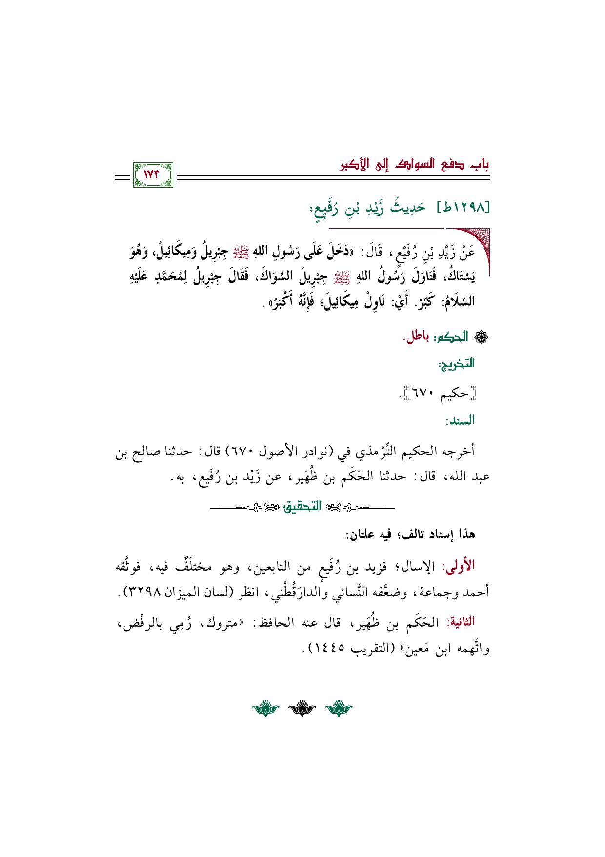 أخرجه الحكيم التِّرْمذي في (نوادر الأصول ٦٧٠) قال: حدثنا صالح بن عبد الله، قال: حدثنا الحَكَم بن ظُهَير، عن زَيْد بن رُفَيع، به.