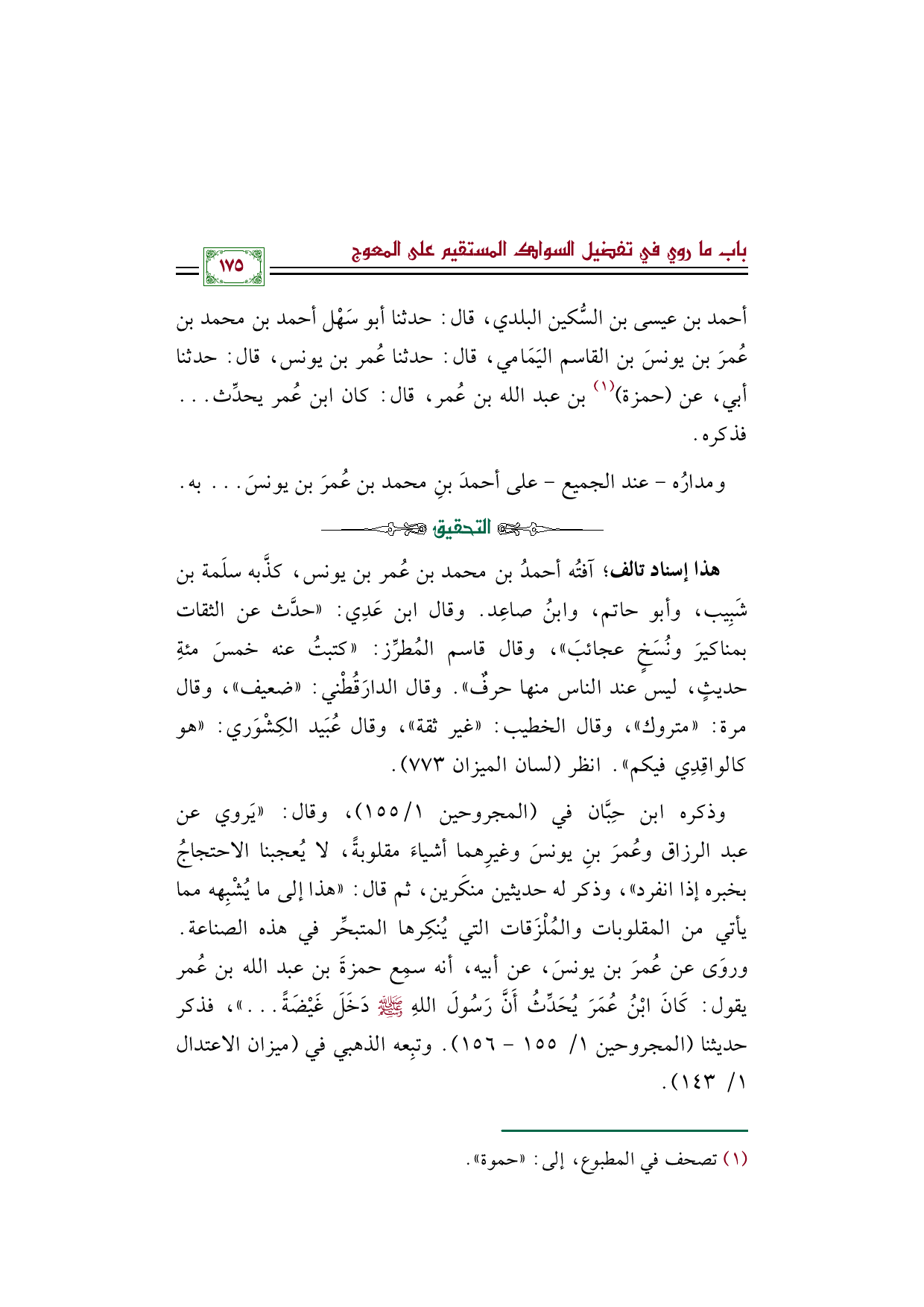 وذكره ابن حِبَّان في (المجروحين ١/ ١٥٥)، وقال: "يَروي عن عبد الرزاق وعُمرَ بنِ يونسَ وغيرِهما أشياءَ مقلوبةً، لا يُعجبنا الاحتجاجُ بخبره إذا انفرد"، وذكر له حديثين منكَرين، ثم قال: "هذا إلى ما يُشْبِهه مما يأتي من المقلوبات والمُلْزَقات التي يُنكِرها المتبحِّر في هذه الصناعة. وروَى عن عُمرَ بن يونسَ، عن أبيه، أنه سمِع حمزةَ بن عبد الله بن عُمر يقول: كَانَ ابْنُ عُمَرَ يُحَدِّثُ أَنَّ رَسُولَ اللهِ صَلَّى اللهُ عَلَيْهِ وَسَلَّمَ دَخَلَ غَيْضَةً ... "، فذكر حديثنا (المجروحين ١/ ١٥٥ - ١٥٦). وتبِعه الذهبي في (ميزان الاعتدال ١/ ١٤٣).