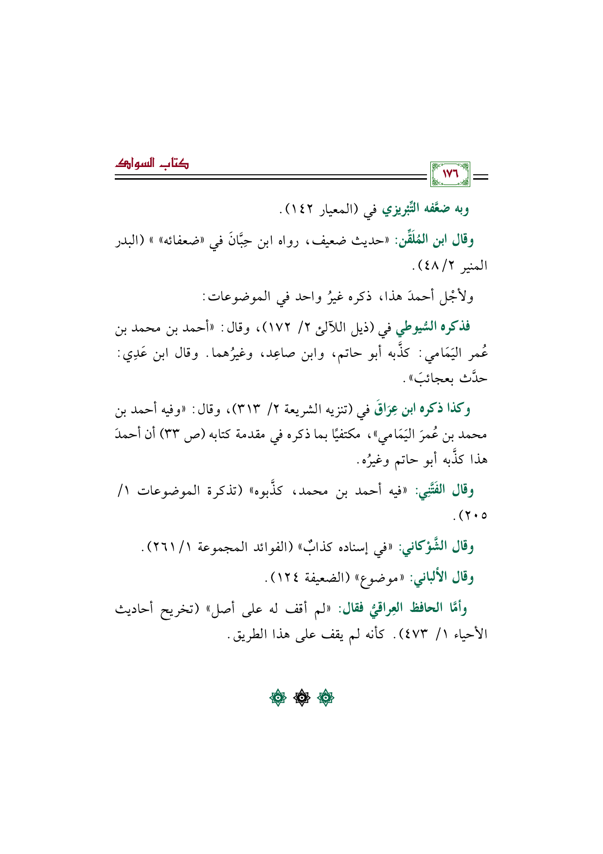 وكذا ذكره ابن عِرَاقَ في (تنزيه الشريعة ٢/ ٣١٣)، وقال: "وفيه أحمد بن محمد بن عُمرَ اليَمَامي"، مكتفيًا بما ذكره في مقدمة كتابه (ص ٣٣) أن أحمدَ هذا كذَّبه أبو حاتم وغيرُه.