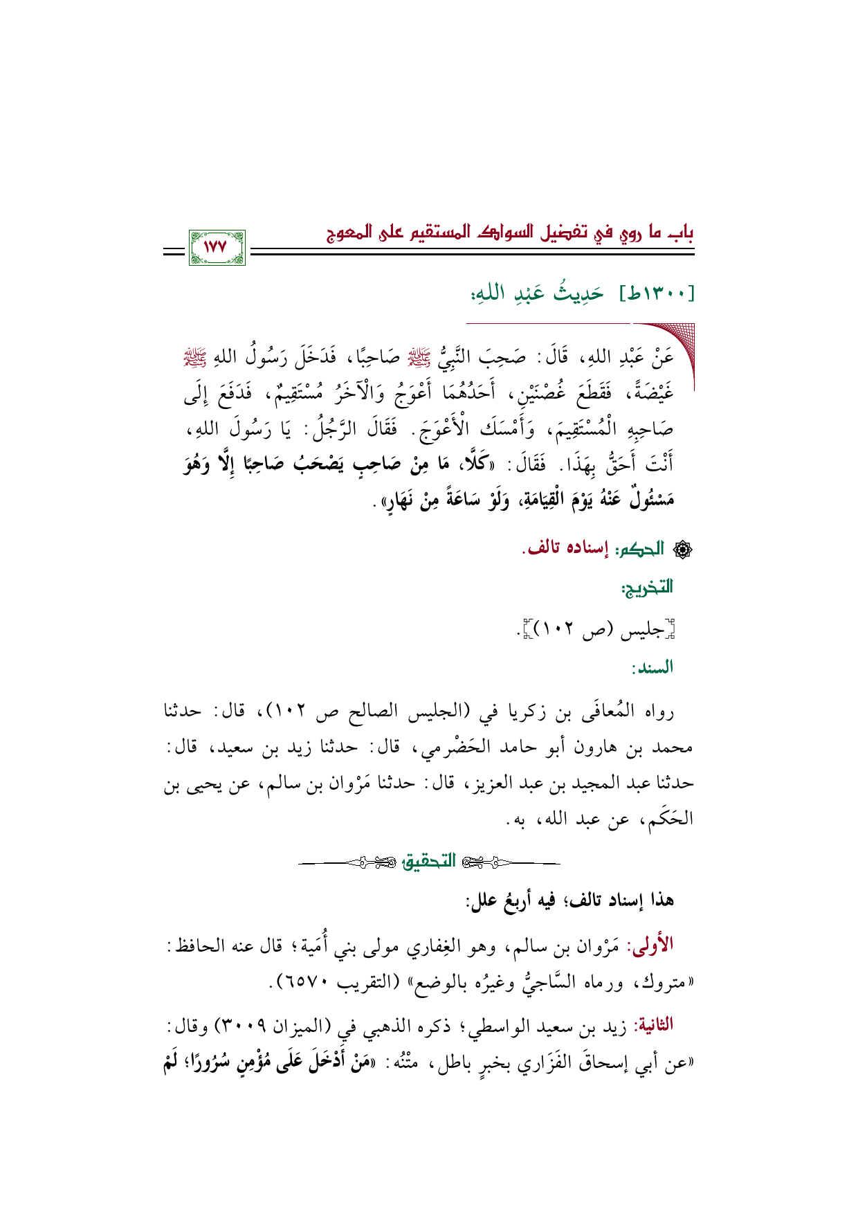 رواه المُعافَى بن زكريا في (الجليس الصالح ص ١٠٢)، قال: حدثنا محمد بن هارون أبو حامد الحَضْرمي، قال: حدثنا زيد بن سعيد، قال: حدثنا عبد المجيد بن عبد العزيز، قال: حدثنا مَرْوان بن سالم، عن يحيى بن الحَكَم، عن عبد الله، به.