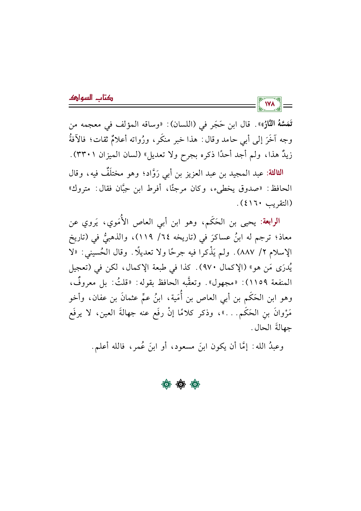 الرابعة: يحيى بن الحَكَم، وهو ابن أبي العاص الأُمَوي، يَروي عن معاذ؛ ترجم له ابنُ عساكرَ في (تاريخه ٦٤/ ١١٩)، والذهبيُّ في (تاريخ الإسلام ٢/ ٨٨٧). ولم يَذْكرا فيه جرحًا ولا تعديلًا. وقال الحُسيني: "لا يُدرَى مَن هو" (الإكمال ٩٧٠). كذا في طبعة الإكمال، لكن في (تعجيل المنفعة ١١٥٩): "مجهول". وتعقَّبه الحافظ بقوله: "قلتُ: بل معروفٌ، وهو ابن الحَكَم بن أبي العاص بن أُمَية، ابنُ عمِّ عثمانَ بن عفان، وأخو مَرْوانَ بنِ الحَكَم ... "، وذكر كلامًا إنْ رفَع عنه جهالةَ العين، لا يرفَع جهالةَ الحال.