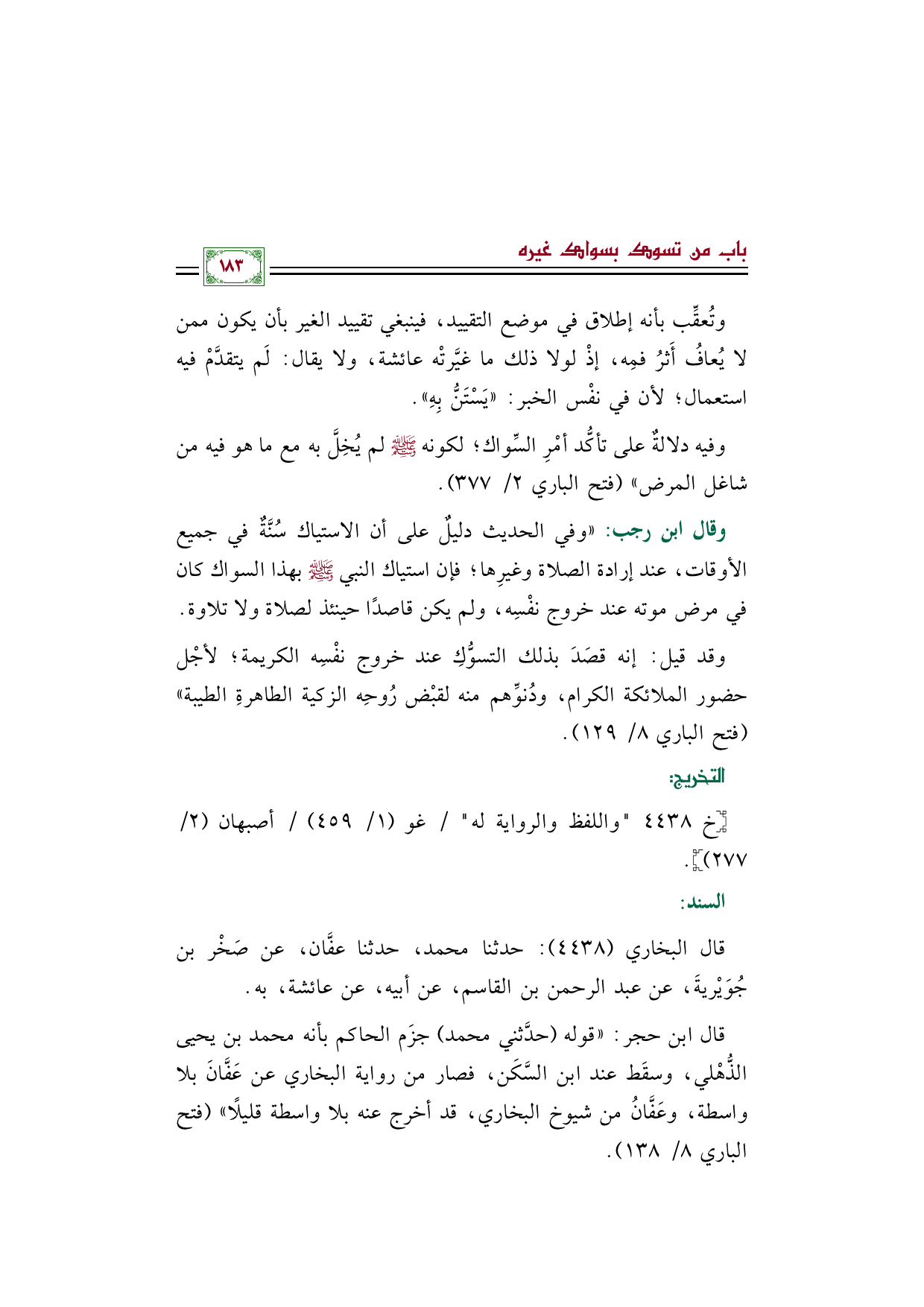 وتُعقِّب بأنه إطلاق في موضع التقييد، فينبغي تقييد الغير بأن يكون ممن لا يُعافُ أَثرُ فمِه، إذْ لولا ذلك ما غيَّرتْه عائشة، ولا يقال: لَم يتقدَّمْ فيه استعمال؛ لأن في نفْس الخبر: ((يَسْتَنُّ بِهِ)).