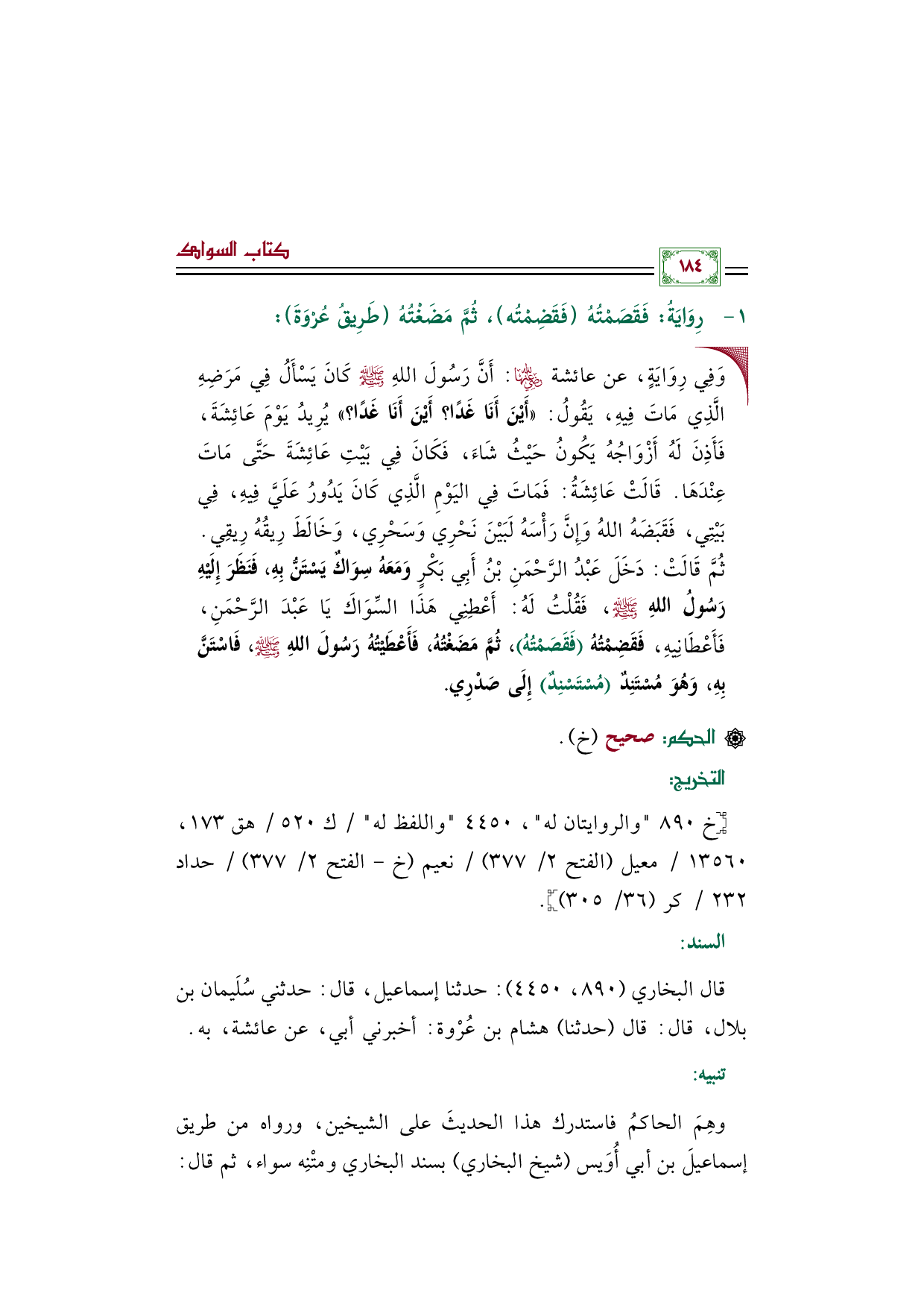 • وَفِي رِوَايَةٍ، عن عائشة رضي الله عنها: أَنَّ رَسُولَ اللهِ صَلَّى اللهُ عَلَيْهِ وَسَلَّمَ كَانَ يَسْأَلُ فِي مَرَضِهِ الَّذِي مَاتَ فِيهِ، يَقُولُ: ((أَيْنَ أَنَا غَدًا؟ أَيْنَ أَنَا غَدًا؟)) يُرِيدُ يَوْمَ عَائِشَةَ، فَأَذِنَ لَهُ أَزْوَاجُهُ يَكُونُ حَيْثُ شَاءَ، فَكَانَ فِي بَيْتِ عَائِشَةَ حَتَّى مَاتَ عِنْدَهَا. قَالَتْ عَائِشَةُ: فَمَاتَ فِي اليَوْمِ الَّذِي كَانَ يَدُورُ عَلَيَّ فِيهِ، فِي بَيْتِي، فَقَبَضَهُ اللهُ وَإِنَّ رَأْسَهُ لَبَيْنَ نَحْرِي وَسَحْرِي، وَخَالَطَ رِيقُهُ رِيقِي. ثُمَّ قَالَتْ: دَخَلَ عَبْدُ الرَّحْمَنِ بْنُ أَبِي بَكْرٍ وَمَعَهُ سِوَاكٌ يَسْتَنُّ بِهِ، فَنَظَرَ إِلَيْهِ رَسُولُ اللهِ صَلَّى اللهُ عَلَيْهِ وَسَلَّمَ، فَقُلْتُ لَهُ: أَعْطِنِي هَذَا السِّوَاكَ يَا عَبْدَ الرَّحْمَنِ، فَأَعْطَانِيهِ، فَقَضِمْتُهُ (فَقَصَمْتُهُ)، ثُمَّ مَضَغْتُهُ، فَأَعْطَيْتُهُ رَسُولَ اللهِ صَلَّى اللهُ عَلَيْهِ وَسَلَّمَ، فَاسْتَنَّ بِهِ، وَهُوَ مُسْتَنِدٌ (مُسْتَسْنِدٌ) إِلَى صَدْرِي.