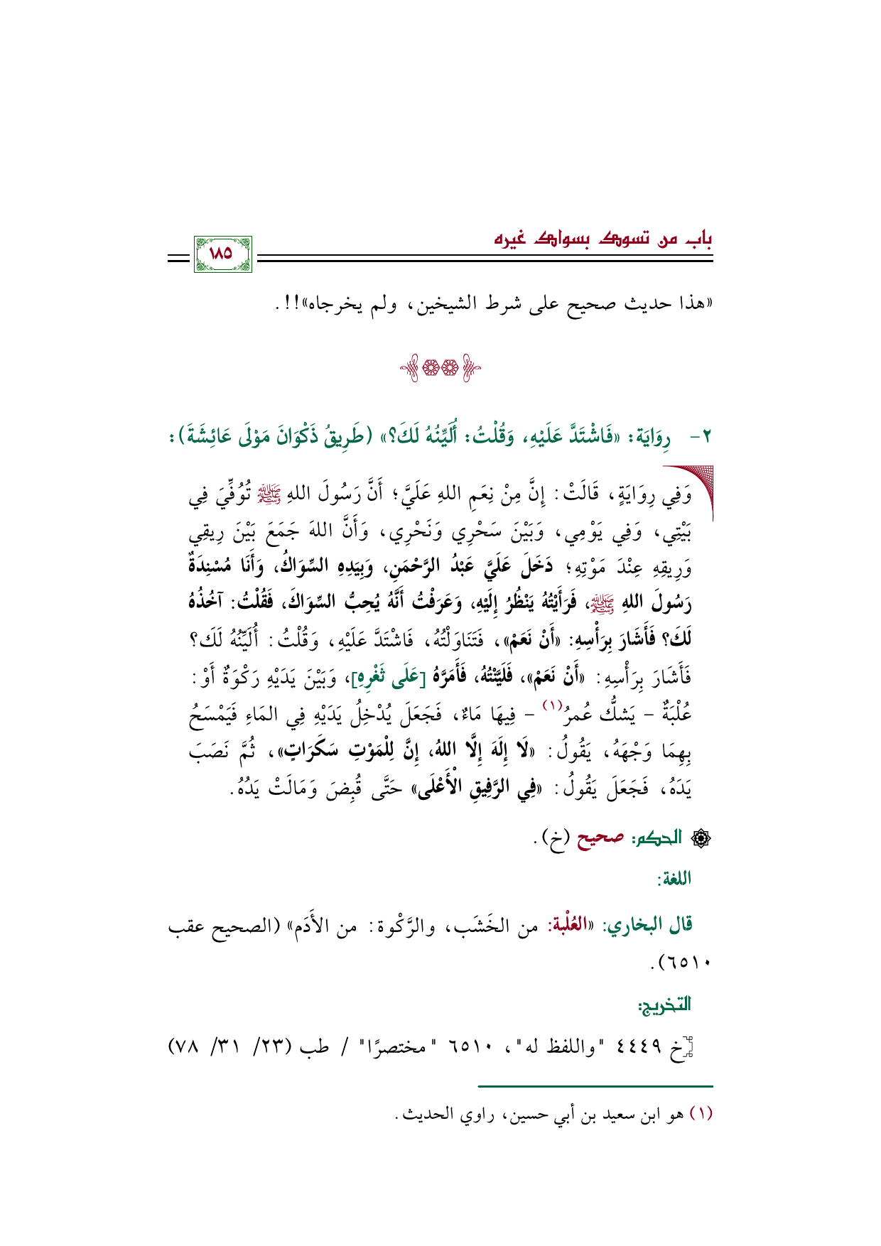 • وَفِي رِوَايَةٍ، قَالَتْ: إِنَّ مِنْ نِعَمِ اللهِ عَلَيَّ؛ أَنَّ رَسُولَ اللهِ صَلَّى اللهُ عَلَيْهِ وَسَلَّمَ تُوُفِّيَ فِي بَيْتِي، وَفِي يَوْمِي، وَبَيْنَ سَحْرِي وَنَحْرِي، وَأَنَّ اللهَ جَمَعَ بَيْنَ رِيقِي وَرِيقِهِ عِنْدَ مَوْتِهِ؛ دَخَلَ عَلَيَّ عَبْدُ الرَّحْمَنِ، وَبِيَدِهِ السِّوَاكُ، وَأَنَا مُسْنِدَةٌ رَسُولَ اللهِ صَلَّى اللهُ عَلَيْهِ وَسَلَّمَ، فَرَأَيْتُهُ يَنْظُرُ إِلَيْهِ، وَعَرَفْتُ أَنَّهُ يُحِبُّ السِّوَاكَ، فَقُلْتُ: آخُذُهُ لَكَ؟ فَأَشَارَ بِرَأْسِهِ: ((أَنْ نَعَمْ))، فَتَنَاوَلْتُهُ، فَاشْتَدَّ عَلَيْهِ، وَقُلْتُ: أُلَيِّنُهُ لَكَ؟ فَأَشَارَ بِرَأْسِهِ: ((أَنْ نَعَمْ))، فَلَيَّنْتُهُ، فَأَمَرَّهُ [عَلَى ثَغْرِهِ]، وَبَيْنَ يَدَيْهِ رَكْوَةٌ أَوْ: عُلْبَةٌ- يَشكُّ عُمرُ (¬١) - فِيهَا مَاءٌ، فَجَعَلَ يُدْخِلُ يَدَيْهِ فِي المَاءِ فَيَمْسَحُ بِهِمَا وَجْهَهُ، يَقُولُ: ((لَا إِلَهَ إِلَّا اللهُ، إِنَّ لِلْمَوْتِ سَكَرَاتٍ))، ثُمَّ نَصَبَ يَدَهُ، فَجَعَلَ يَقُولُ: ((فِي الرَّفِيقِ الْأَعْلَى)) حَتَّى قُبِضَ وَمَالَتْ يَدُهُ.