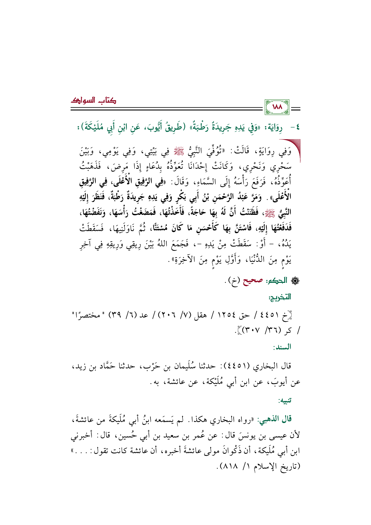 قال الذهبي: "رواه البخاري هكذا. لم يَسمَعه ابنُ أبي مُلَيكةَ من عائشةَ، لأن عيسى بن يونسَ قال: عن عُمر بن سعيد بن أبي حُسين، قال: أخبرني ابن أبي مُلَيكة، أن ذَكْوانَ مولى عائشةَ أخبره، أن عائشة كانت تقول: ... " (تاريخ الإسلام ١/ ٨١٨).