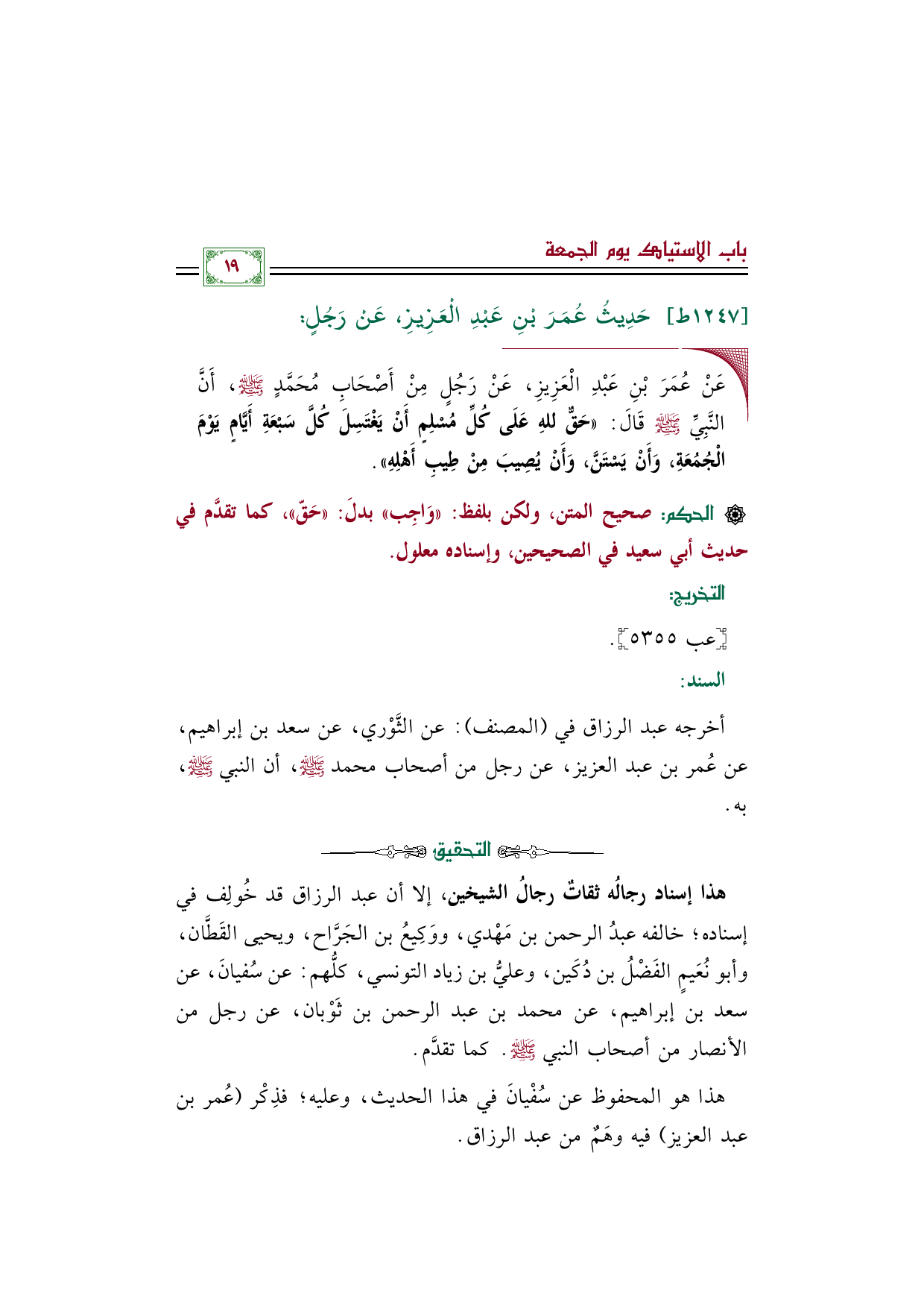 أخرجه عبد الرزاق في (المصنف): عن الثَّوْري، عن سعد بن إبراهيم، عن عُمر بن عبد العزيز، عن رجل من أصحاب محمد صلى الله عليه وسلم، أن النبي صلى الله عليه وسلم، به.