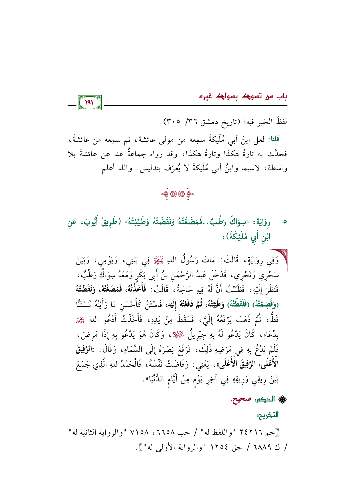 ◼ وَفِي رِوَايَةٍ، قَالَتْ: مَاتَ رَسُولُ اللهِ صَلَّى اللهُ عَلَيْهِ وَسَلَّمَ فِي بَيْتِي، وَيَوْمِي، وَبَيْنَ سَحْرِي وَنَحْرِي، فَدَخَلَ عَبدُ الرَّحْمَنِ بنُ أَبِي بَكْرٍ وَمَعَهُ سِوَاكٌ رَطْبٌ، فَنَظَرَ إِلَيْهِ، فَظَنَنْتُ أَنَّ لَهُ فِيهِ حَاجَةً، قَالَتْ: فَأَخَذْتُهُ، فَمَضَغْتُهُ، وَنَفَضْتُهُ (وَقَضِمْتُهُ) (فَلَقَطْتُهُ) وَطَيَّبْتُهُ، ثُمَّ دَفَعْتُهُ إِلَيْهِ، فَاسْتَنَّ كَأَحْسَنِ مَا رَأَيْتُهُ مُسْتَنًّا قَطُّ، ثُمَّ ذَهَبَ يَرْفَعُهُ إِلَيَّ، فَسَقَطَ مِنْ يَدِهِ، فَأَخَذْتُ أَدْعُو اللهَ عَزَّ وَجَلَّ بِدُعَاءٍ، كَانَ يَدْعُو لَهُ بِهِ جِبْرِيلُ عَلَيْهِ السَّلَامُ، وَكَانَ هُوَ يَدْعُو بِهِ إِذَا مَرِضَ، فَلَمْ يَدْعُ بِهِ فِي مَرَضِهِ ذَلِكَ، فَرَفَعَ بَصَرَهُ إِلَى السَّمَاءِ، وَقَالَ: ((الرَّفِيقَ الْأَعْلَى، الرَّفِيقَ الْأَعْلَى))، يَعْنِي: وَفَاضَتْ نَفْسُهُ، فَالْحَمْدُ للهِ الَّذِي جَمَعَ بَيْنَ رِيقِي وَرِيقِهِ فِي آخِرِ يَوْمٍ مِنْ أَيَّامِ الدُّنْيَا".