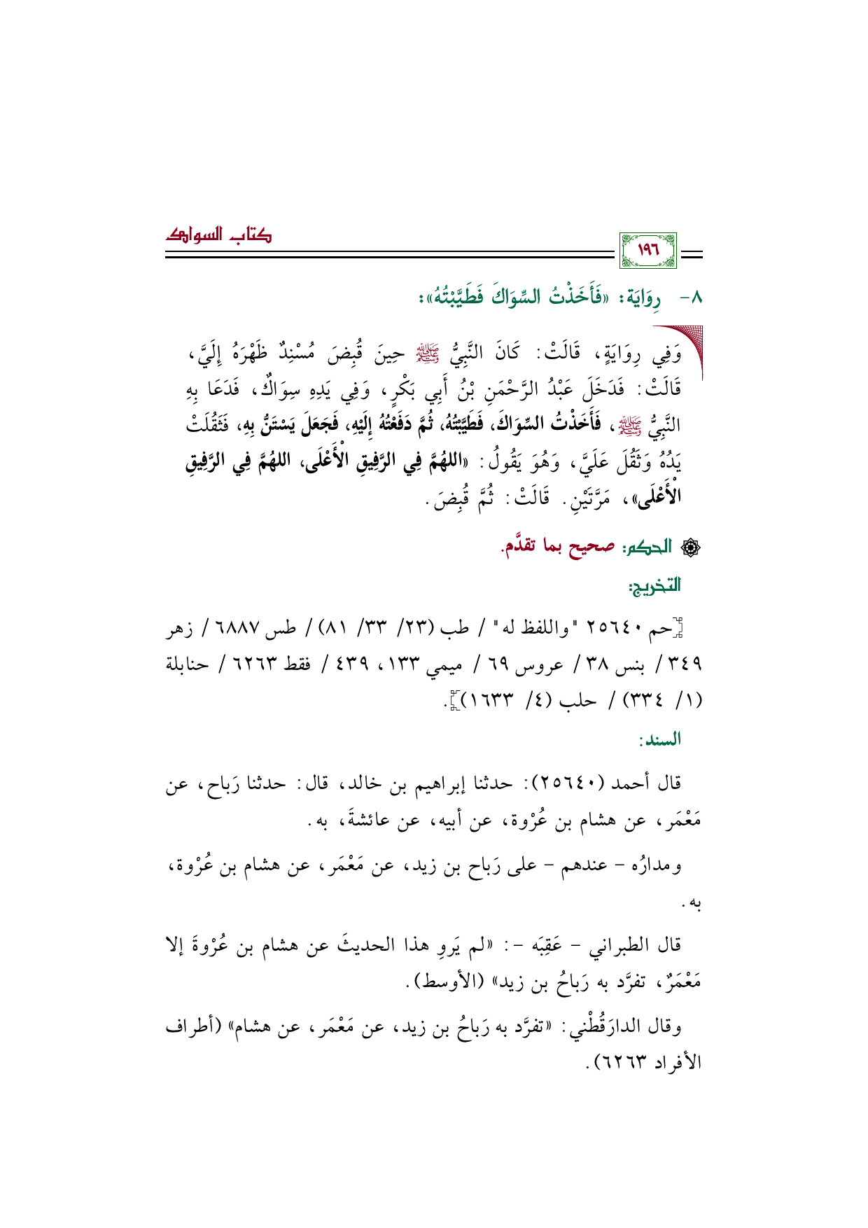 قال أحمد (٢٥٦٤٠): حدثنا إبراهيم بن خالد، قال: حدثنا رَباح، عن مَعْمَر، عن هشام بن عُرْوة، عن أبيه، عن عائشةَ، به.