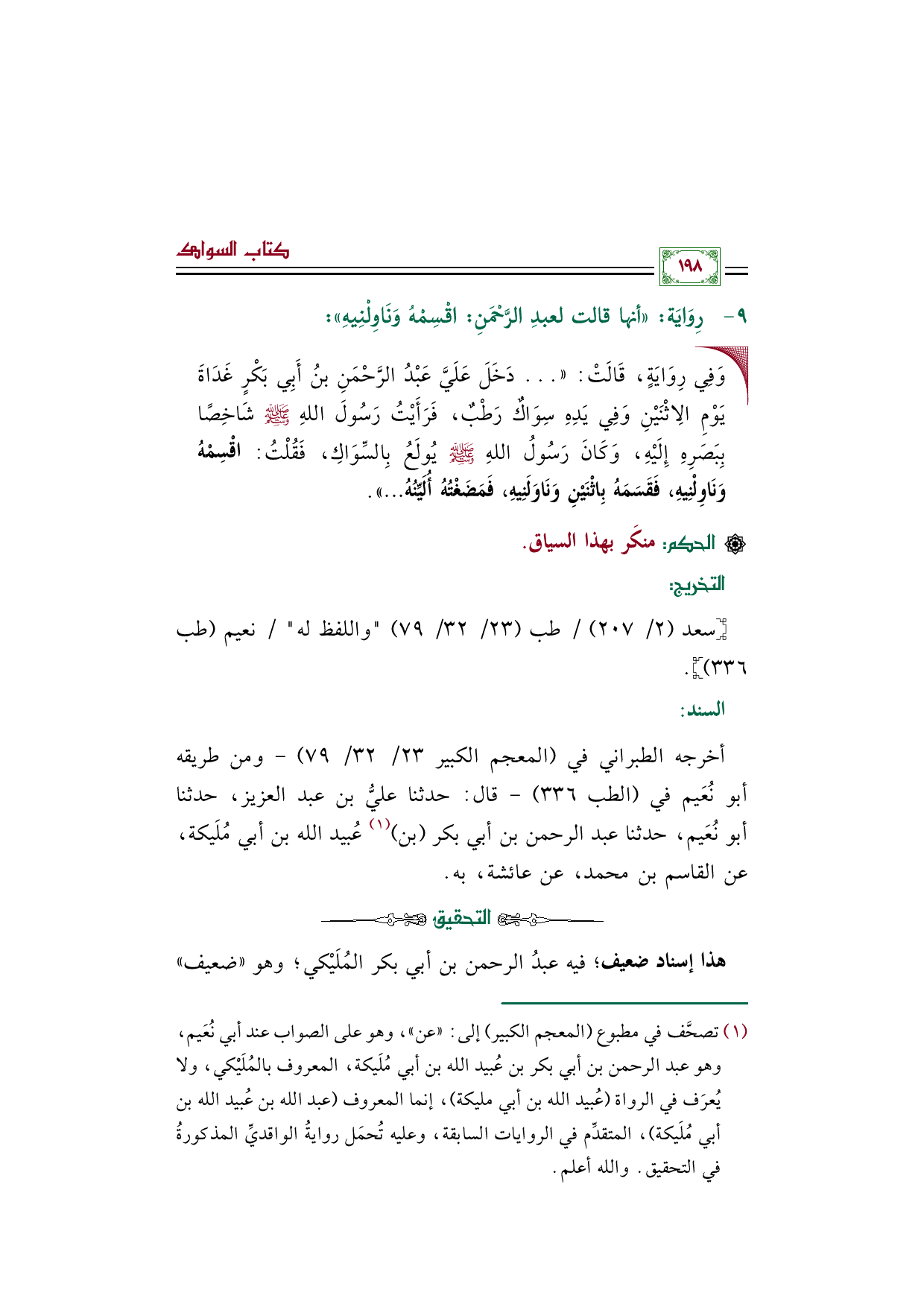 أخرجه الطبراني في (المعجم الكبير ٢٣/ ٣٢/ ٧٩) - ومن طريقه أبو نُعَيم في (الطب ٣٣٦) - قال: حدثنا عليُّ بن عبد العزيز، حدثنا أبو نُعَيم، حدثنا عبد الرحمن بن أبي بكر (بن) (¬١) عُبيد الله بن أبي مُلَيكة، عن القاسم بن محمد، عن عائشة، به.