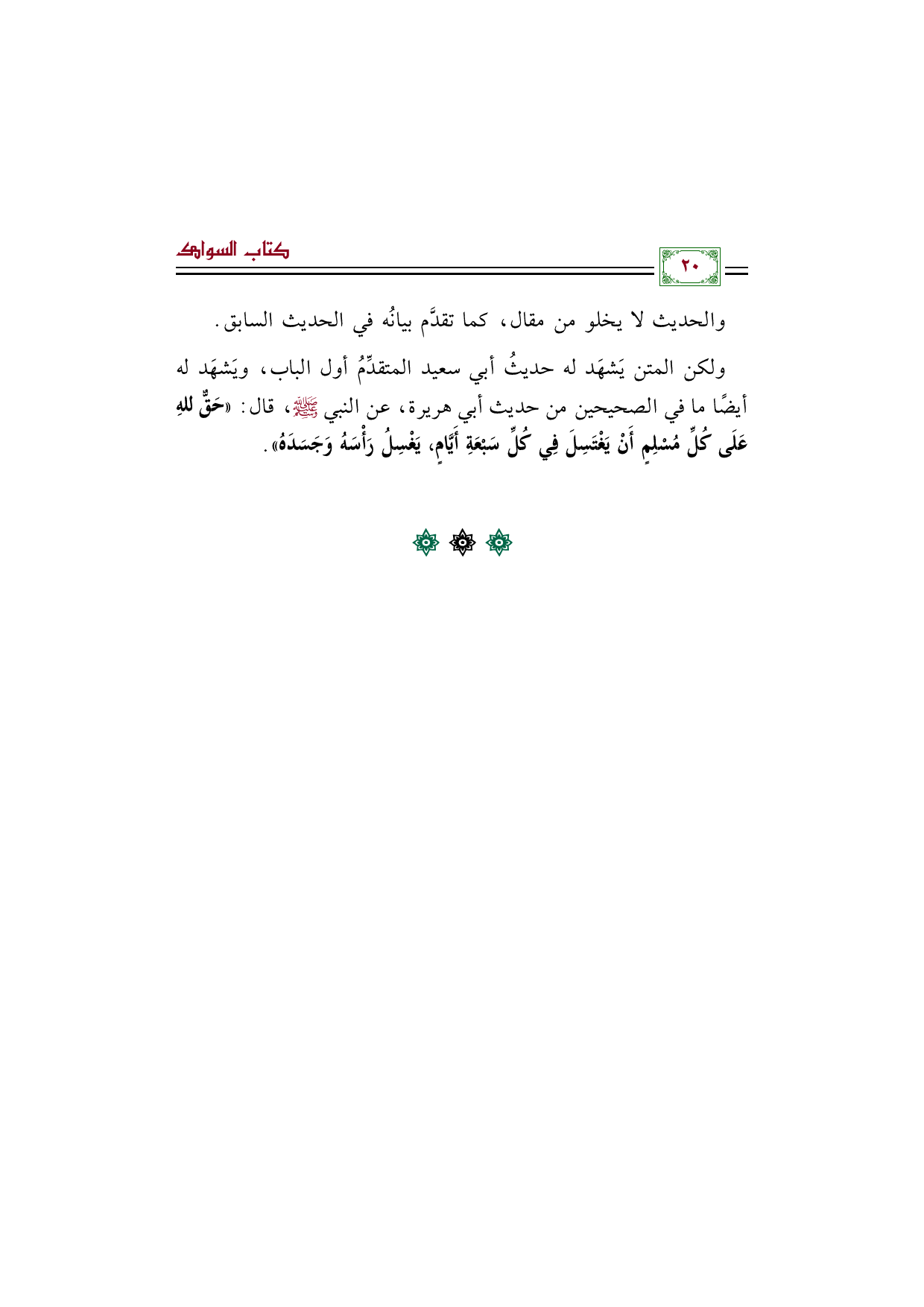 ولكن المتن يَشهَد له حديثُ أبي سعيد المتقدِّمُ أول الباب، ويَشهَد له أيضًا ما في الصحيحين من حديث أبي هريرة، عن النبي صلى الله عليه وسلم، قال: ((حَقٌّ للهِ عَلَى كُلِّ مُسْلِمٍ أَنْ يَغْتَسِلَ فِي كُلِّ سَبْعَةِ أَيَّامٍ، يَغْسِلُ رَأْسَهُ وَجَسَدَهُ)).