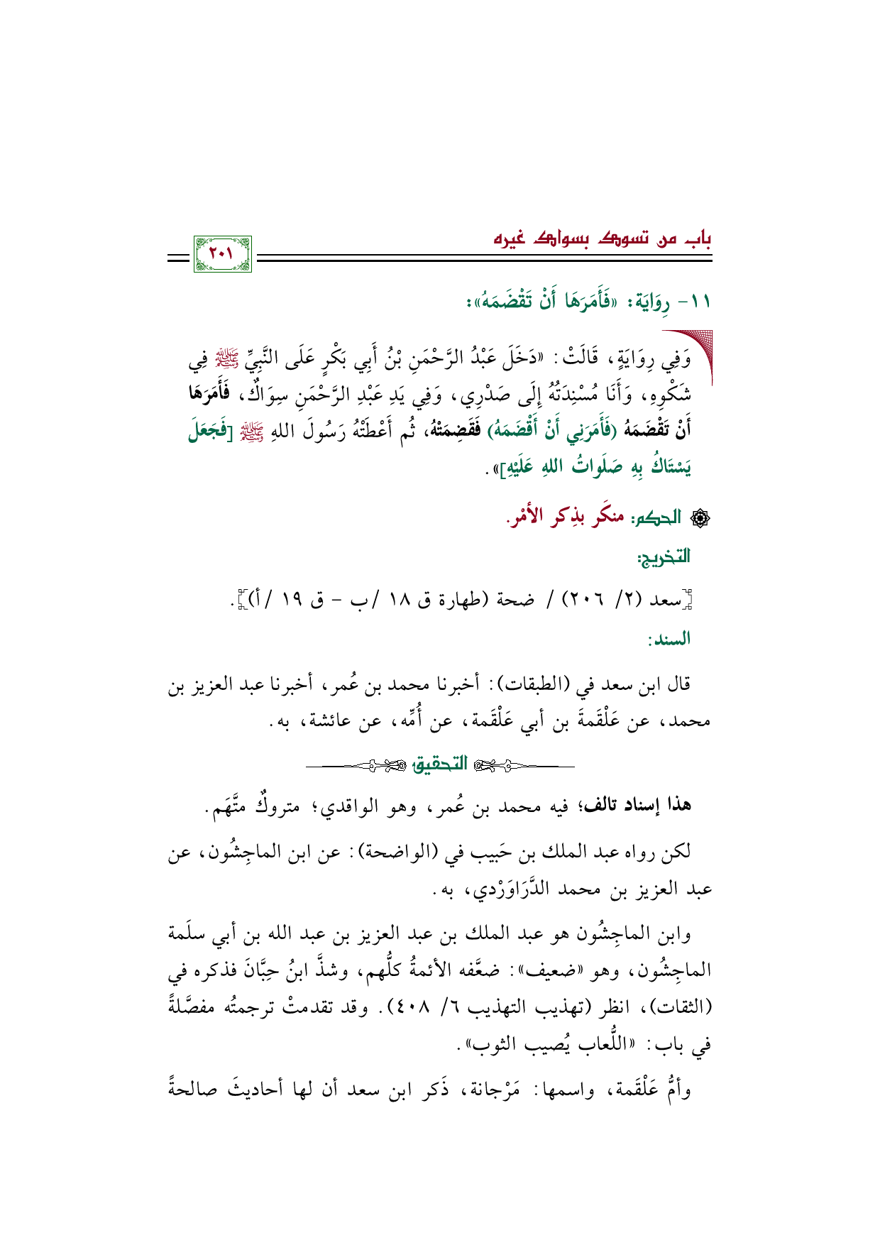 قال ابن سعد في (الطبقات): أخبرنا محمد بن عُمر، أخبرنا عبد العزيز بن محمد، عن عَلْقَمةَ بن أبي عَلْقَمة، عن أُمِّه، عن عائشة، به.