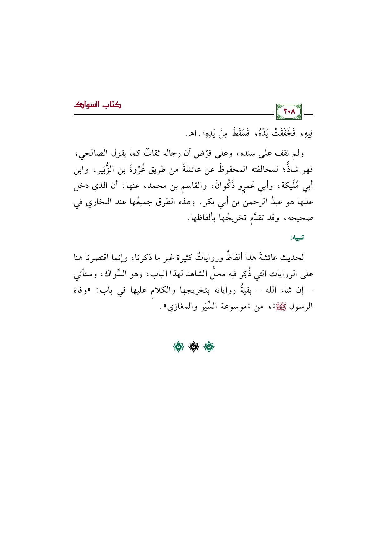 ولم نقف على سنده، وعلى فرْض أن رجاله ثقاتٌ كما يقول الصالحي، فهو شاذٌّ؛ لمخالفته المحفوظَ عن عائشةَ من طريق عُرْوةَ بن الزُّبَير، وابنِ أبي مُلَيكة، وأبي عَمرٍو ذَكْوانَ، والقاسمِ بن محمد، عنها: أن الذي دخل عليها هو عبدُ الرحمن بن أبي بكر. وهذه الطرق جميعُها عند البخاري في صحيحه، وقد تقدَّم تخريجُها بألفاظها.