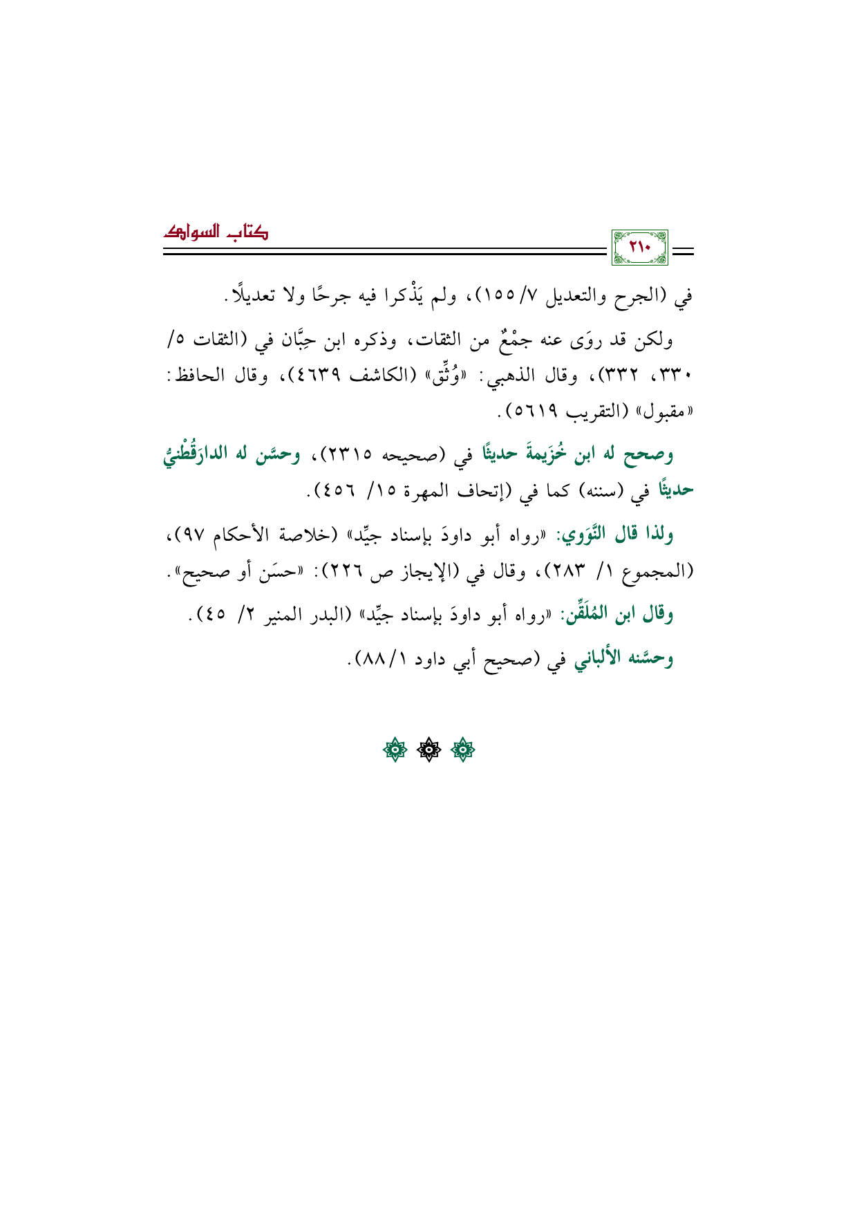 ولذا قال النَّوَوي: "رواه أبو داودَ بإسناد جيِّد" (خلاصة الأحكام ٩٧)، (المجموع ١/ ٢٨٣)، وقال في (الإيجاز ص ٢٢٦): "حسَن أو صحيح".
