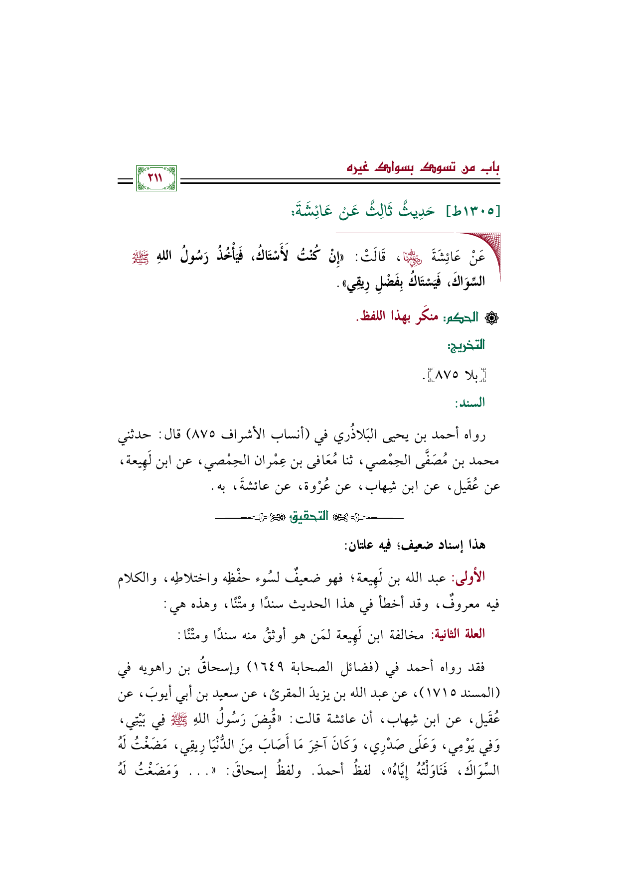 فقد رواه أحمد في (فضائل الصحابة ١٦٤٩) وإسحاقُ بن راهويه في (المسند ١٧١٥)، عن عبد الله بن يزيدَ المقرئ، عن سعيد بن أبي أيوبَ، عن عُقَيل، عن ابن شِهاب، أن عائشة قالت: ((قُبِضَ رَسُولُ اللهِ صَلَّى اللهُ عَلَيْهِ وَسَلَّمَ فِي بَيْتِي، وَفِي يَوْمِي، وَعَلَى صَدْرِي، وَكَانَ آخِرَ مَا أَصَابَ مِنَ الدُّنْيَا رِيقِي، مَضَغْتُ لَهُ السِّوَاكَ، فَنَاوَلْتُهُ إِيَّاهُ))، لفظُ أحمدَ. ولفظُ إسحاقَ: (( ... وَمَضَغْتُ لَهُ