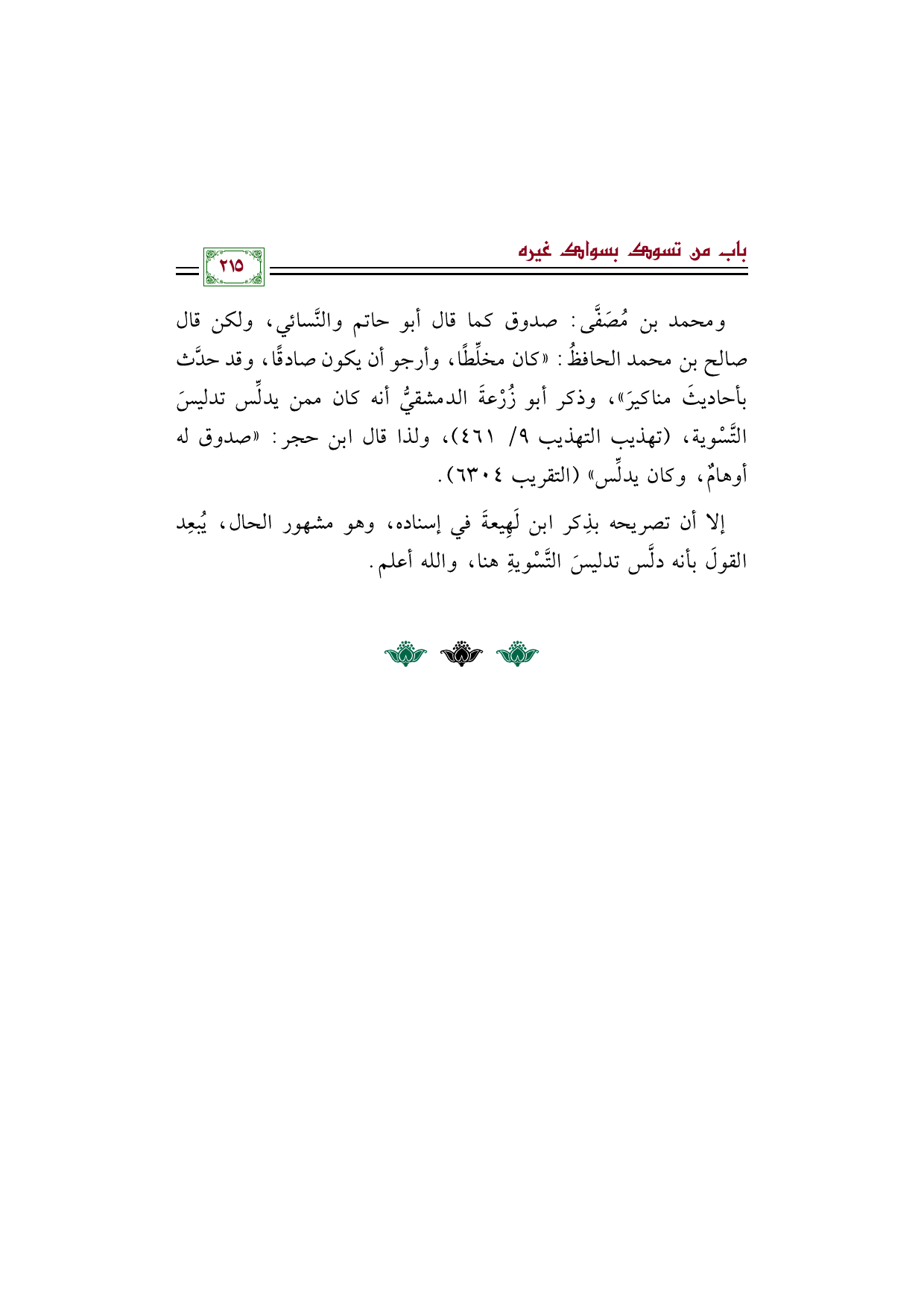 ومحمد بن مُصَفَّى: صدوق كما قال أبو حاتم والنَّسائي، ولكن قال صالح بن محمد الحافظُ: "كان مخلِّطًا، وأرجو أن يكون صادقًا، وقد حدَّث بأحاديثَ مناكيرَ"، وذكر أبو زُرْعةَ الدمشقيُّ أنه كان ممن يدلِّس تدليسَ التَّسْوية، (تهذيب التهذيب ٩/ ٤٦١)، ولذا قال ابن حجر: "صدوق له أوهامٌ، وكان يدلِّس" (التقريب ٦٣٠٤).