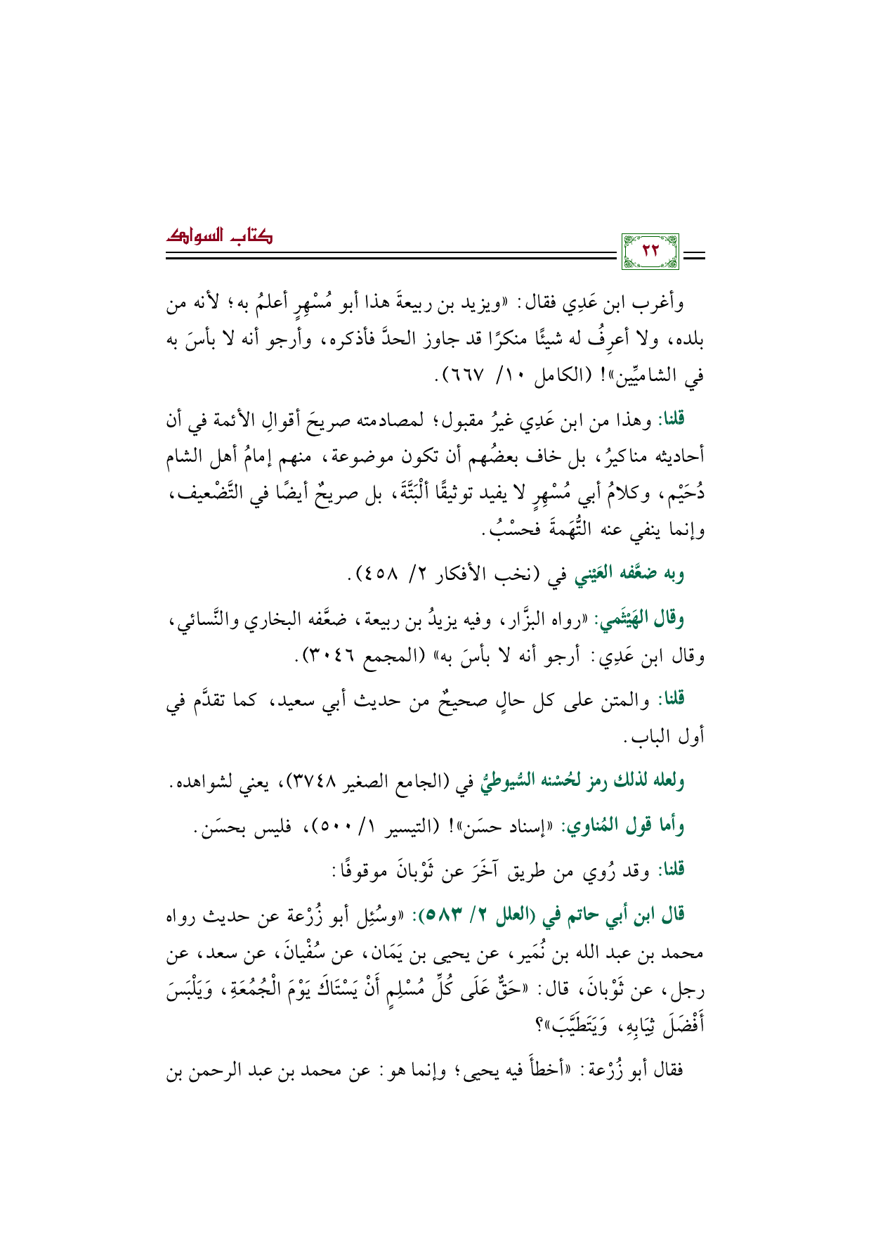 قال ابن أبي حاتم في (العلل ٢/ ٥٨٣): "وسُئِل أبو زُرْعة عن حديث رواه محمد بن عبد الله بن نُمَير، عن يحيى بن يَمَان، عن سُفْيانَ، عن سعد، عن رجل، عن ثَوْبانَ، قال: ((حَقٌّ عَلَى كُلِّ مُسْلِمٍ أَنْ يَسْتَاكَ يَوْمَ الْجُمُعَةِ، وَيَلْبَسَ أَفْضَلَ ثِيَابِهِ، وَيَتَطَيَّبَ))؟