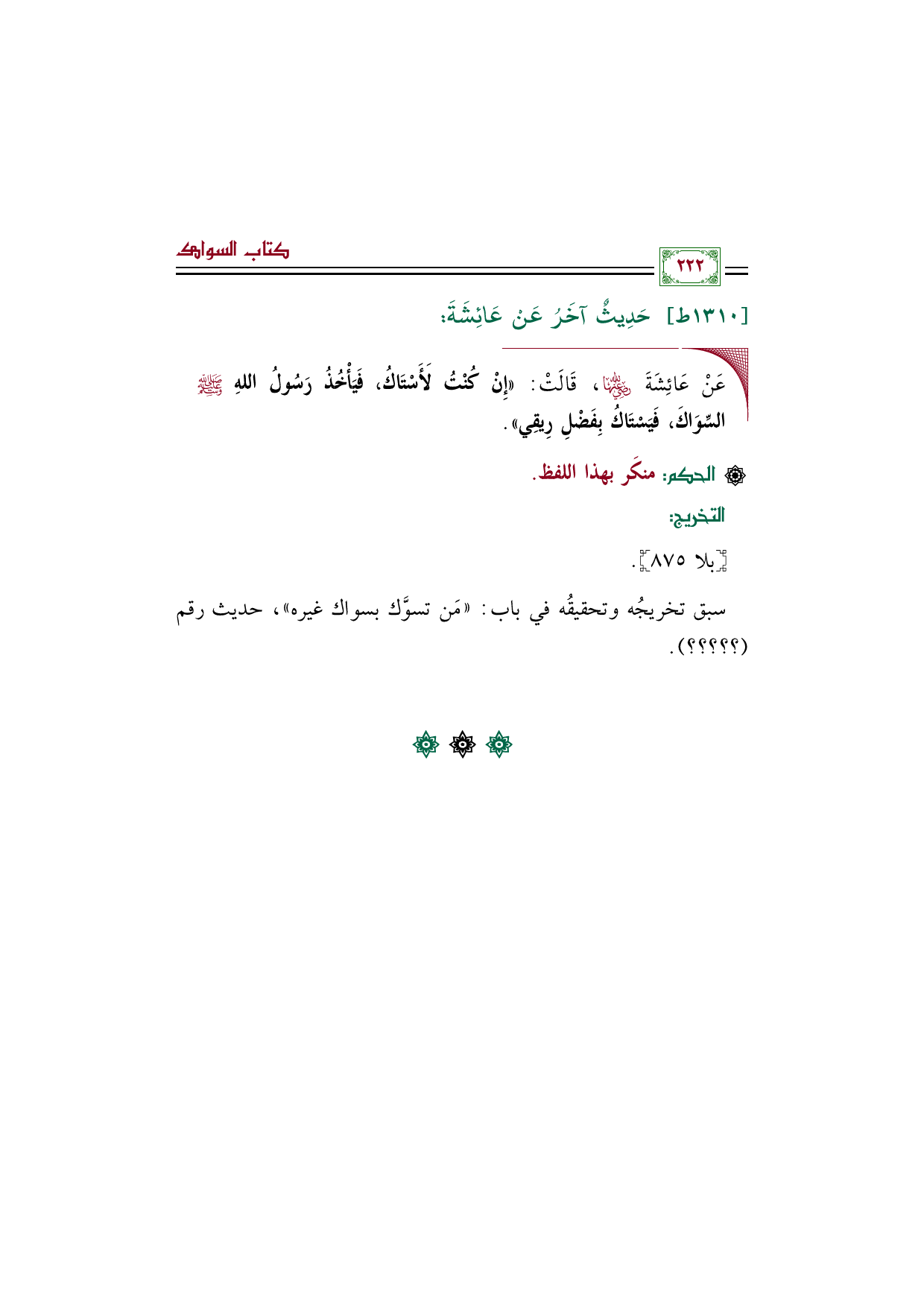 سبق تخريجُه وتحقيقُه في باب: "مَن تسوَّك بسواك غيره"، حديث رقم (؟ ؟ ؟ ؟ ؟ ).