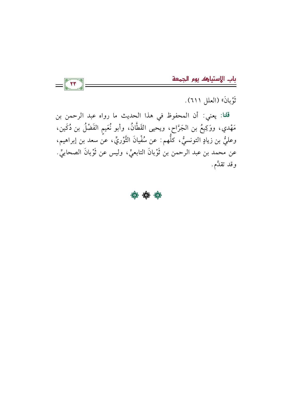 قلنا: يعني: أن المحفوظ في هذا الحديث ما رواه عبد الرحمن بن مَهْدي، ووَكِيعُ بن الجَرَّاح، ويحيى القَطَّانُ، وأبو نُعَيمٍ الفَضْلُ بن دُكَين، وعليُّ بن زيادٍ التونسيُّ، كلُّهم: عن سُفْيانَ الثَّوْريِّ، عن سعد بن إبراهيم، عن محمد بن عبد الرحمن بن ثَوْبانَ التابعيِّ، وليس عن ثَوْبانَ الصحابيِّ. وقد تقدَّم.