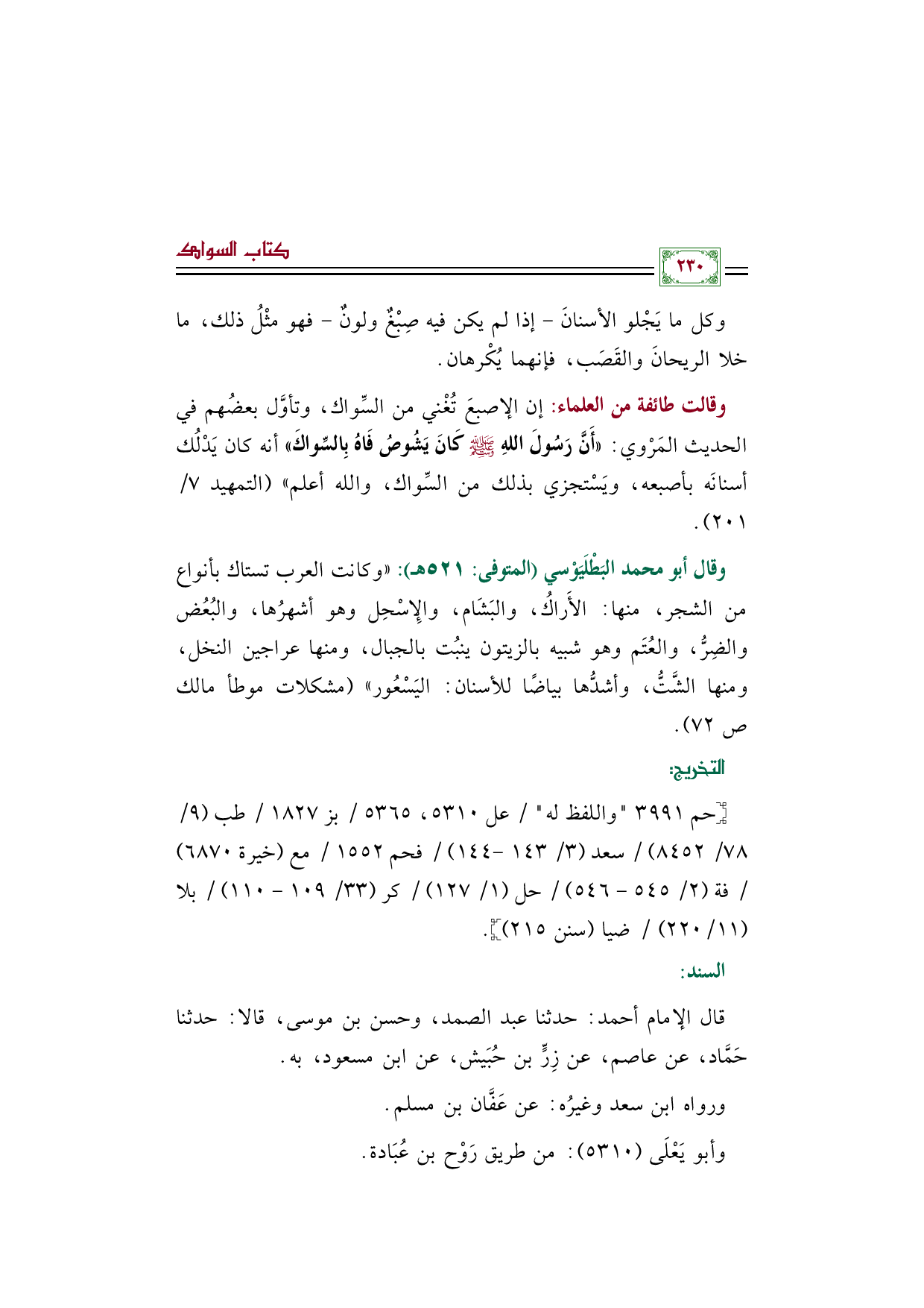وكل ما يَجْلو الأسنانَ- إذا لم يكن فيه صِبْغٌ ولونٌ- فهو مثْلُ ذلك، ما خلا الريحانَ والقَصَب، فإنهما يُكْرهان.