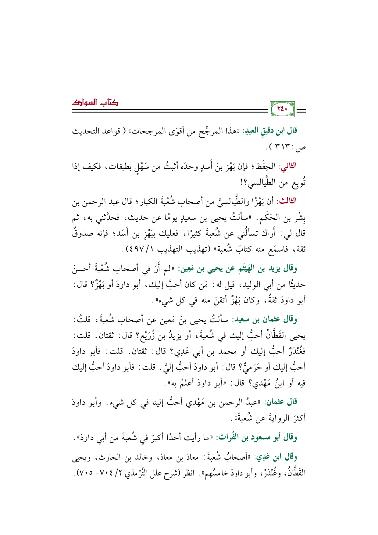 الثالث: أن بَهْزًا والطَّيالسيَّ من أصحاب شُعْبةَ الكبار؛ قال عبد الرحمن بن بِشْر بن الحَكَم: "سألتُ يحيى بن سعيدٍ يومًا عن حديث، فحدَّثني به، ثم قال لي: أَراك تسألُني عن شُعبةَ كثيرًا، فعليك ببَهْزِ بن أَسَد؛ فإنه صدوقٌ ثقة، فاسمَع منه كتابَ شُعبة" (تهذيب التهذيب ١/ ٤٩٧).