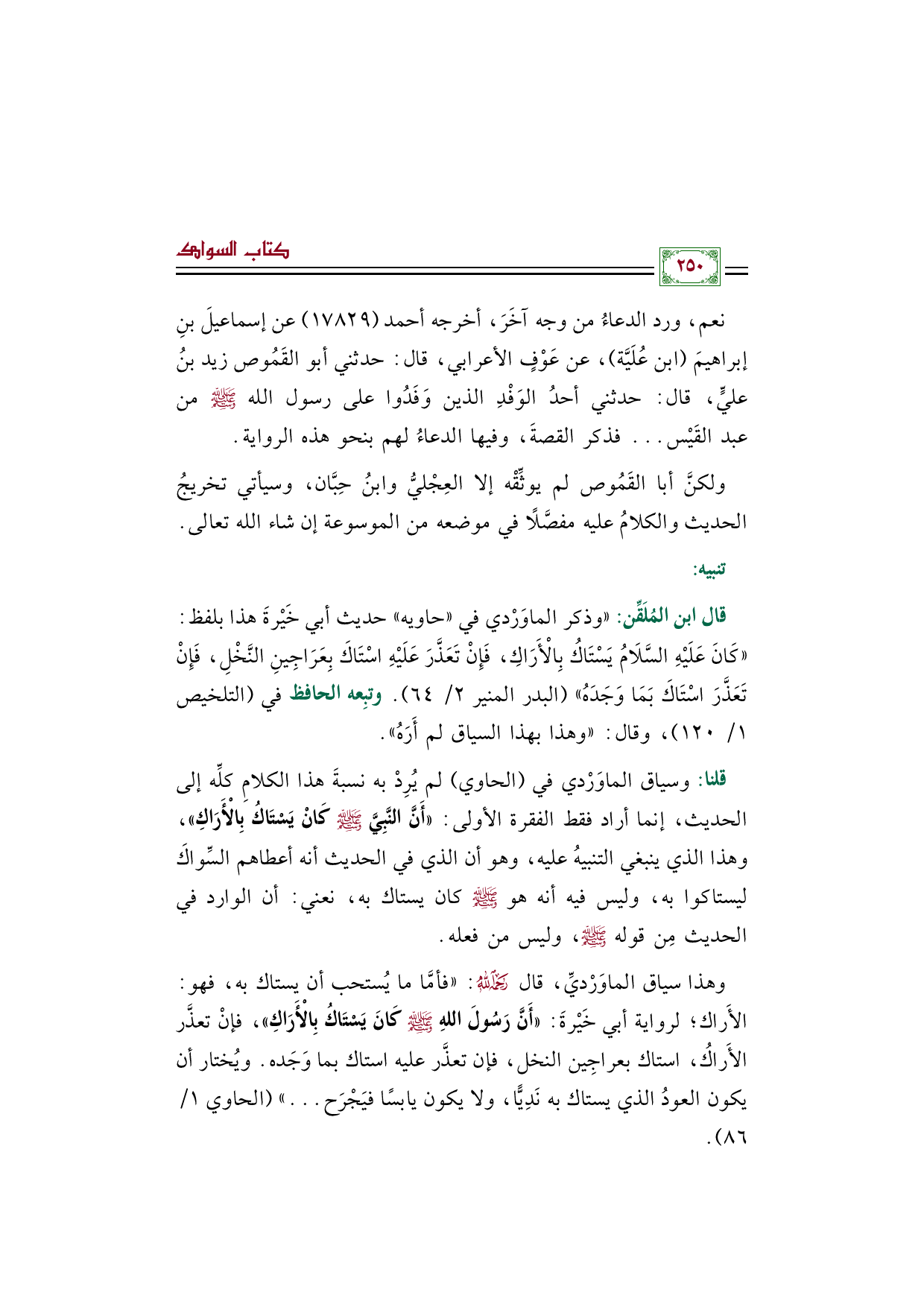 قلنا: وسياق الماوَرْدي في (الحاوي) لم يُرِدْ به نسبةَ هذا الكلامِ كلِّه إلى الحديث، إنما أراد فقط الفقرة الأولى: ((أَنَّ النَّبِيَّ صَلَّى اللهُ عَلَيْهِ وَسَلَّمَ كَانْ يَسْتَاكُ بِالْأَرَاكِ))، وهذا الذي ينبغي التنبيهُ عليه، وهو أن الذي في الحديث أنه أعطاهم السِّواكَ ليستاكوا به، وليس فيه أنه هو صلى الله عليه وسلم كان يستاك به، نعني: أن الوارد في الحديث مِن قوله صلى الله عليه وسلم، وليس من فعله.