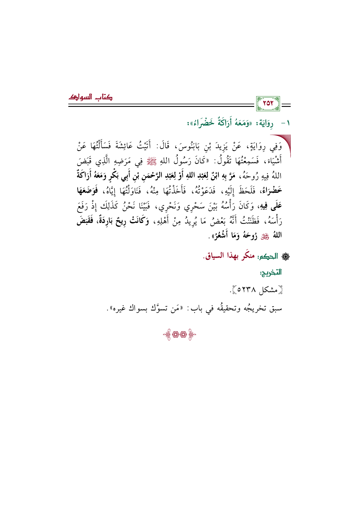 • وَفِي رِوَايَةٍ، عَنْ يَزِيدَ بْنِ بَابَنُوسَ، قَالَ: أَتَيْتُ عَائِشَةَ فَسَأَلْتُهَا عَنْ أَشْيَاءَ، فَسَمِعْتُهَا تَقُولُ: ((كَانَ رَسُولُ اللهِ صَلَّى اللهُ عَلَيْهِ وَسَلَّمَ فِي مَرَضِهِ الَّذِي قَبَضَ اللهُ فِيهِ رُوحَهُ، مَرَّ بِهِ ابْنٌ لِعَبْدِ اللهِ أَوْ لِعَبْدِ الرَّحْمَنِ بْنِ أَبِي بَكْرٍ وَمَعَهُ أَرَاكَةٌ خَضْرَاءُ، فَلَحَظَ إِلَيْهِ، فَدَعَوْتُهُ، فَأَخَذْتُهَا مِنْهُ، فَنَاوَلْتُهَا إِيَّاهُ، فَوَضَعَهَا عَلَى فِيهِ، وَكَانَ رَأْسُهُ بَيْنَ سَحْرِي وَنَحْرِي، فَبَيْنَا نَحْنُ كَذَلِكَ إِذْ رَفَعَ رَأْسَهُ، فَظَنَنْتُ أَنَّهُ بَعْضُ مَا يُرِيدُ مِنْ أَهْلِهِ، وَكَانَتْ رِيحٌ بَارِدَةٌ، فَقَبَضَ اللهُ عَزَّ وَجَلَّ رُوحَهُ وَمَا أَشْعُرُ)).