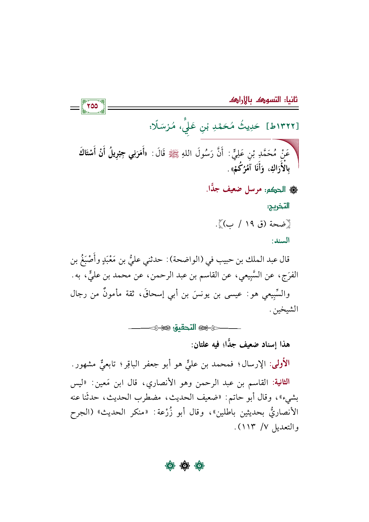قال عبد الملك بن حبيب في (الواضحة): حدثني عليُّ بن مَعْبَدٍ وأَصْبَغُ بن الفرَج، عن السَّبِيعي، عن القاسم بن عبد الرحمن، عن محمد بن عليٍّ، به.