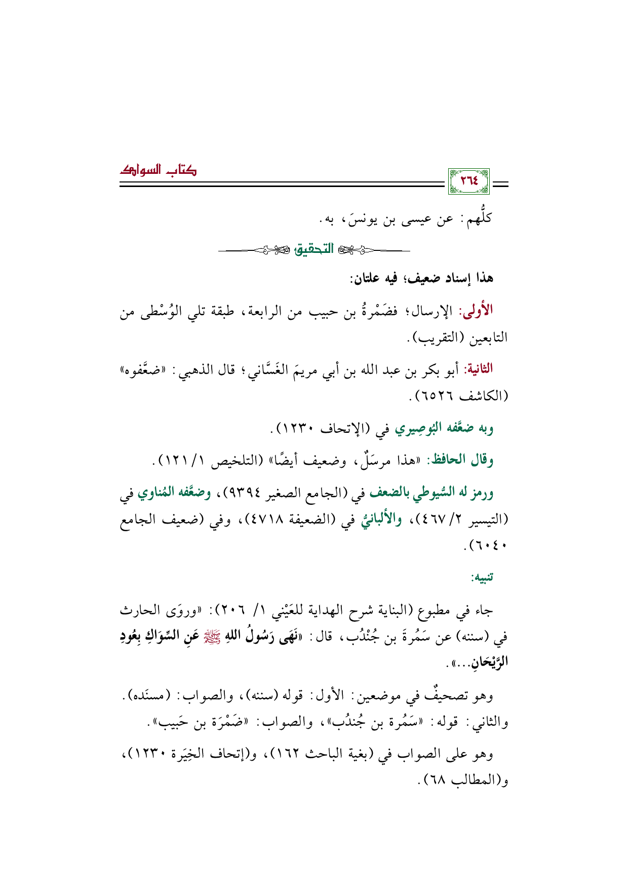 وهو تصحيفٌ في موضعين: الأول: قوله "سننه"، والصواب: "مسنَده". والثاني: قوله: "سَمُرة بن جُندُب"، والصواب: "ضَمْرَة بن حَبيب".