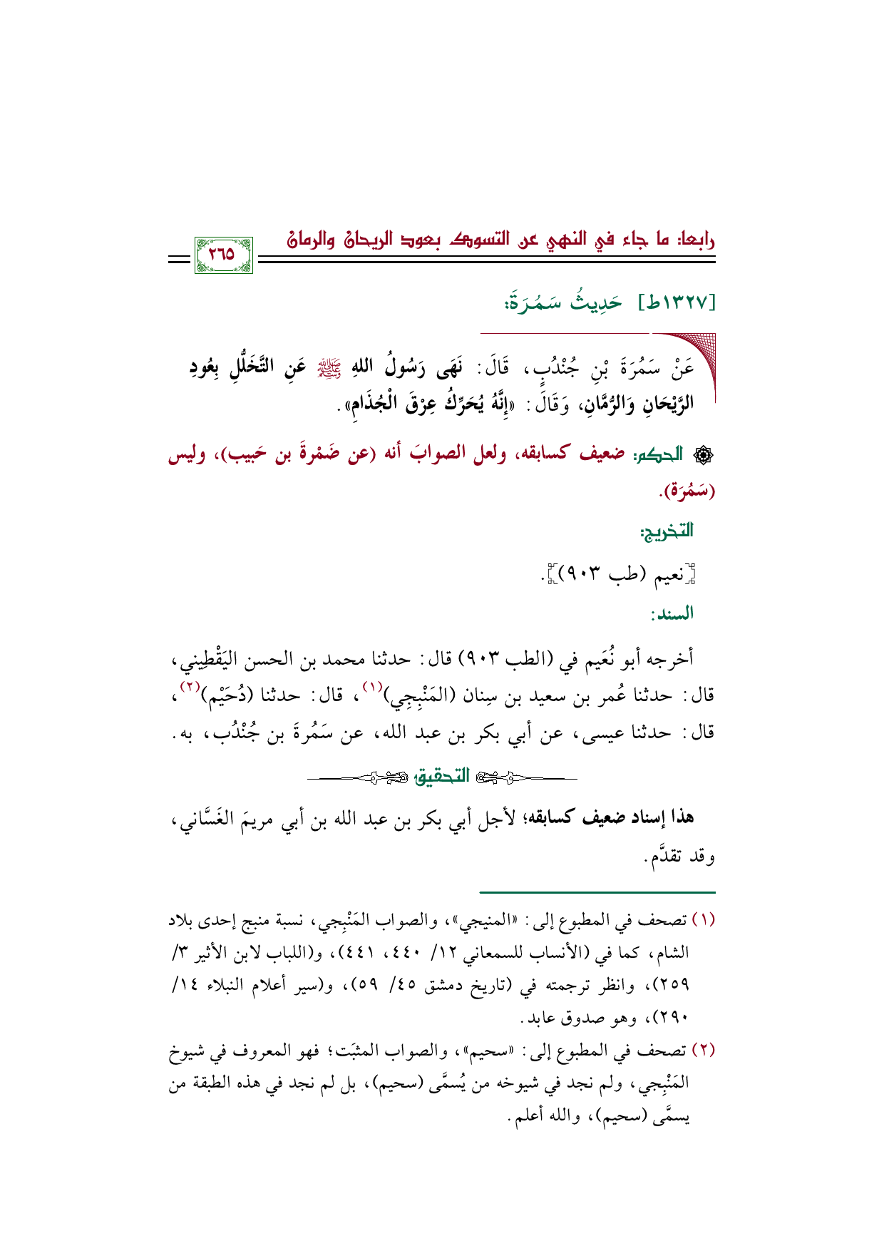 أخرجه أبو نُعَيم في (الطب ٩٠٣) قال: حدثنا محمد بن الحسن اليَقْطِيني، قال: حدثنا عُمر بن سعيد بن سِنان (المَنْبِجِي) (¬١)، قال: حدثنا (دُحَيْم) (¬٢)، قال: حدثنا عيسى، عن أبي بكر بن عبد الله، عن سَمُرةَ بن جُنْدُب، به.