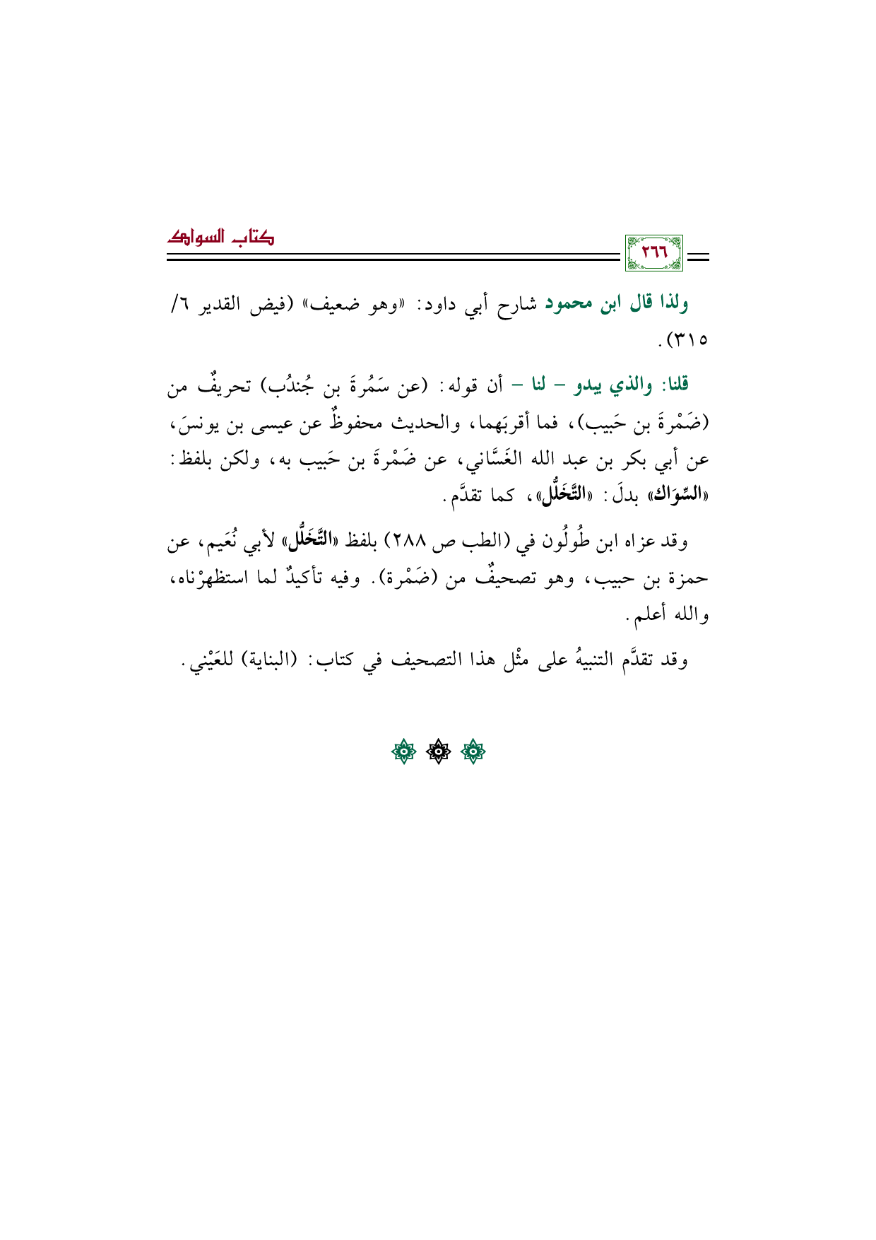 قلنا: والذي يبدو- لنا- أن قوله: (عن سَمُرةَ بن جُندُب) تحريفٌ من (ضَمْرةَ بن حَبيب)، فما أقربَهما، والحديث محفوظٌ عن عيسى بن يونسَ، عن أبي بكر بن عبد الله الغَسَّاني، عن ضَمْرةَ بن حَبيب به، ولكن بلفظ: "السِّوَاك" بدلَ: "التَّخَلُّل"، كما تقدَّم.