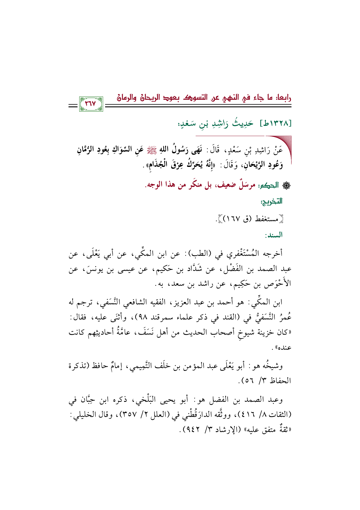أخرجه المُسْتَغْفري في (الطب): عن ابن المكِّي، عن أبي يَعْلَى، عن عبد الصمد بن الفَضْل، عن شَدَّاد بن حَكيم، عن عيسى بن يونسَ، عن الأَحْوَص بن حَكِيم، عن راشد بن سعد، به.
