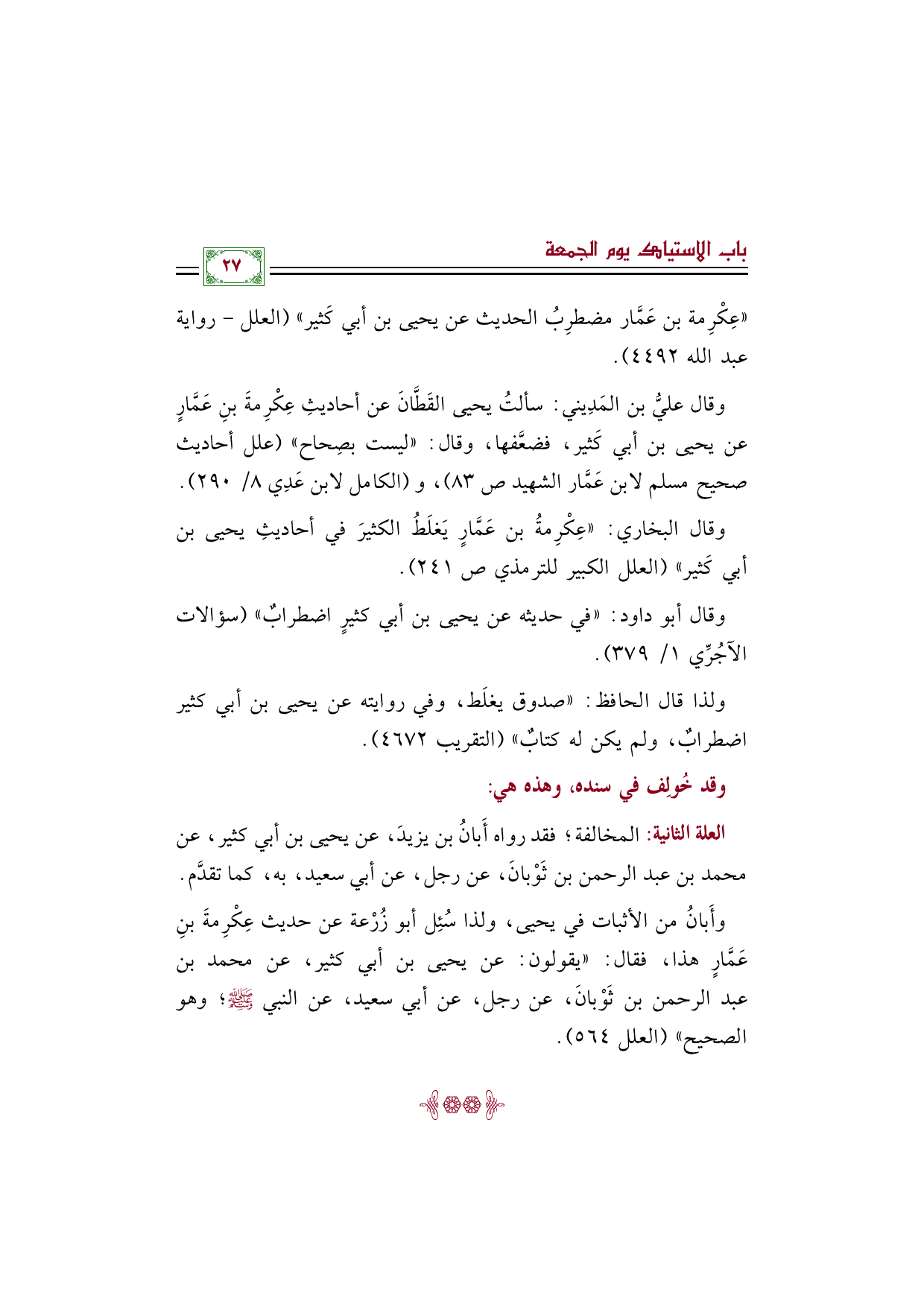 وقال عليُّ بن المَدِيني: سألتُ يحيى القَطَّانَ عن أحاديثِ عِكْرِمةَ بنِ عَمَّارٍ عن يحيى بن أبي كَثير، فضعَّفها، وقال: "ليست بصِحاح" (علل أحاديث صحيح مسلم لابن عَمَّار الشهيد ص ٨٣)، و (الكامل لابن عَدِي ٨/ ٢٩٠).